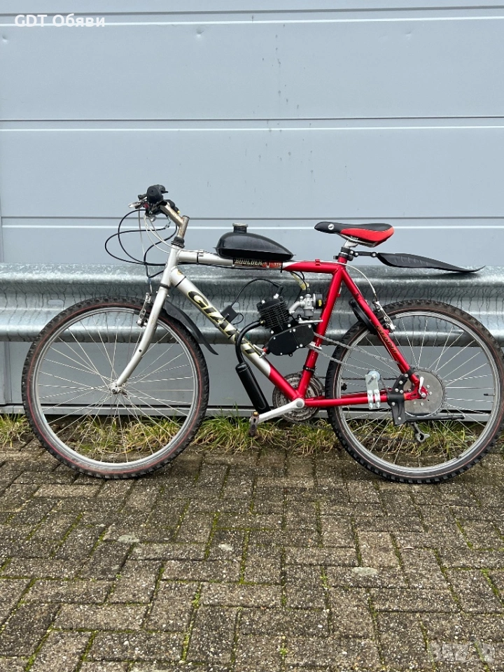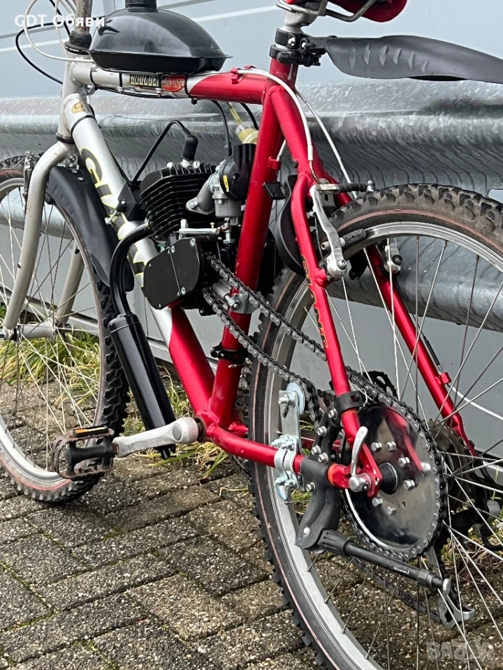 Планински велосипед с 50cc двутактов двигател. Пали лесно и върви около 40–50 км/ч.