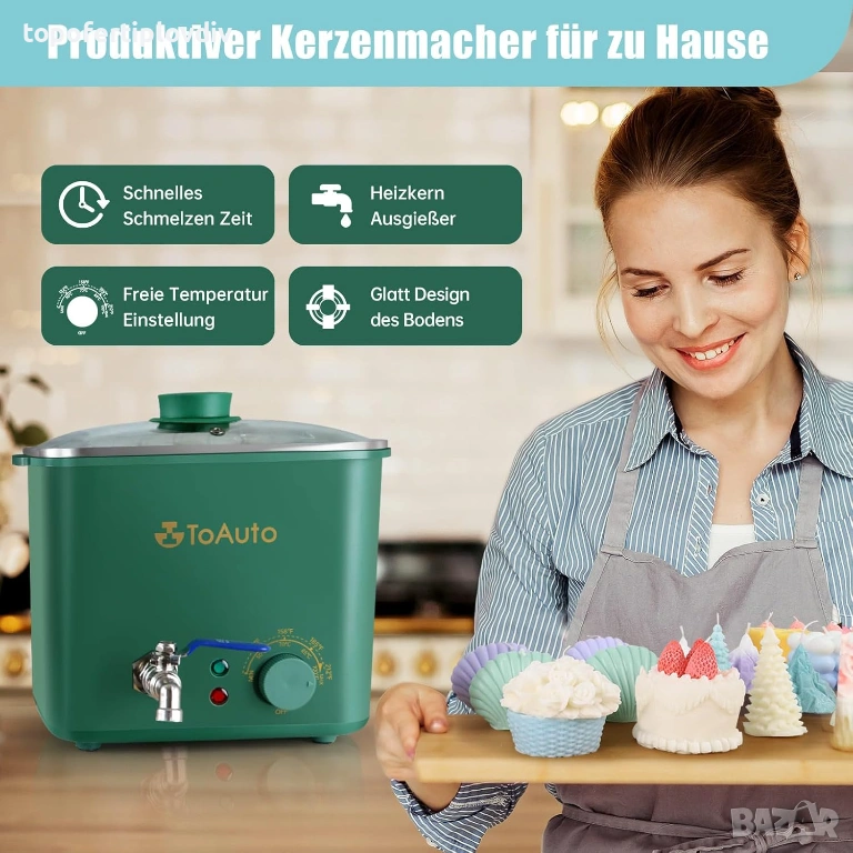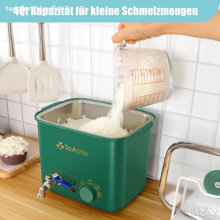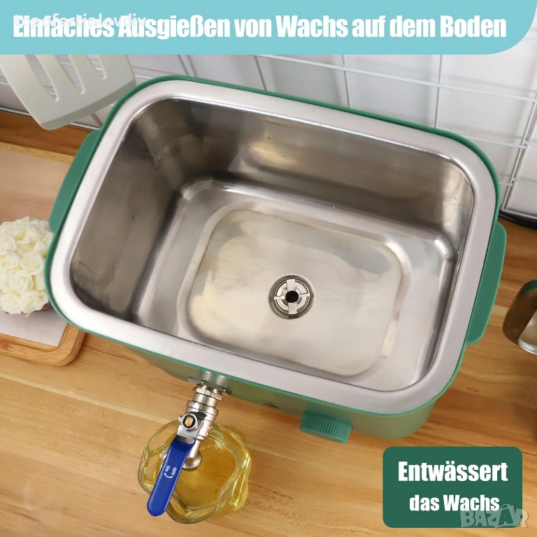 ПРОДУКТИВЕН СЪД ЗА ТОПЕНЕ НА ВОСЪК Преминал от метода с двоен котел към нов електрически съд за топене за вашето хоби „Направи си сам“ със свещи. Добър съд за топене на восък за малки количества свещи, който топи 1,5 кг восък за по-малко от 20 минути при 100°C. Това е 10 пъти по-бързо, отколкото с метода с двоен котел!