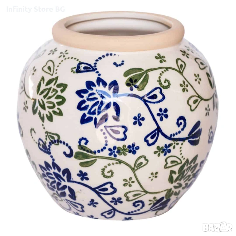 Добавете свежест и артистичен акцент във вашия интериор с тази елегантна керамична ваза. Декорирана с фин флорален мотив в синьо и зелено върху бяла основа, тя внася усещане за хармония и естествена красота във всяка стая.