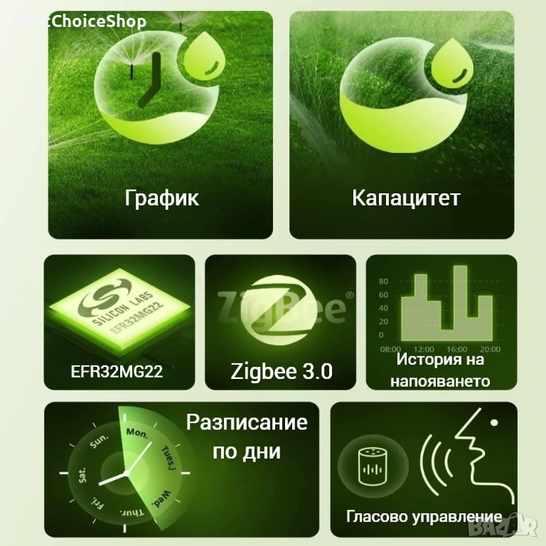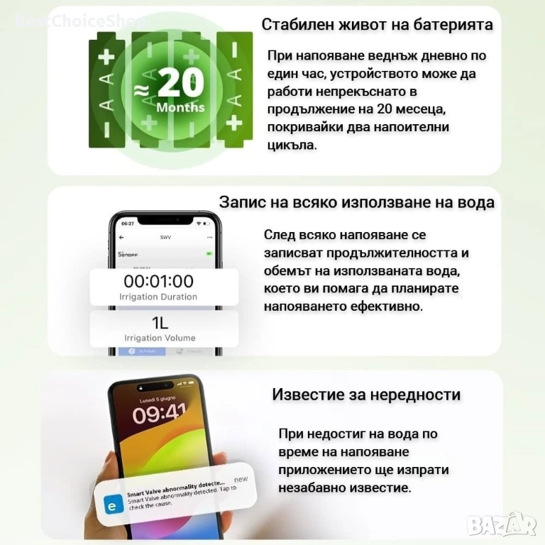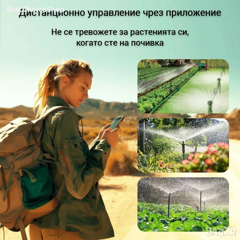 Подходящ за автоматично поливане, контрол на водата по график или дистанционно спиране при нужда.