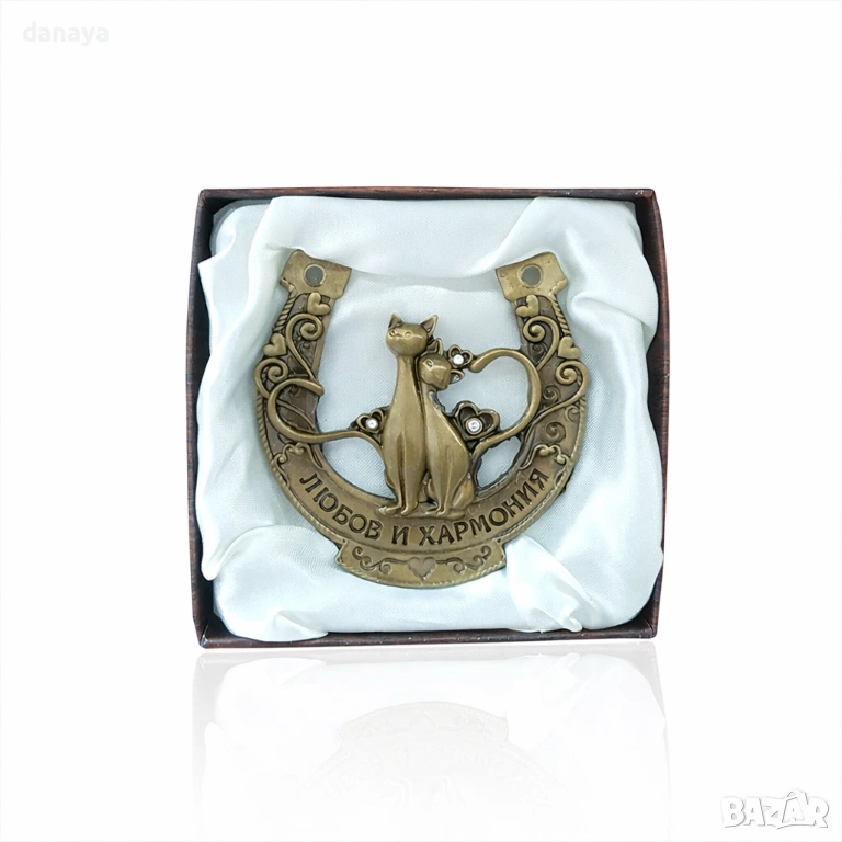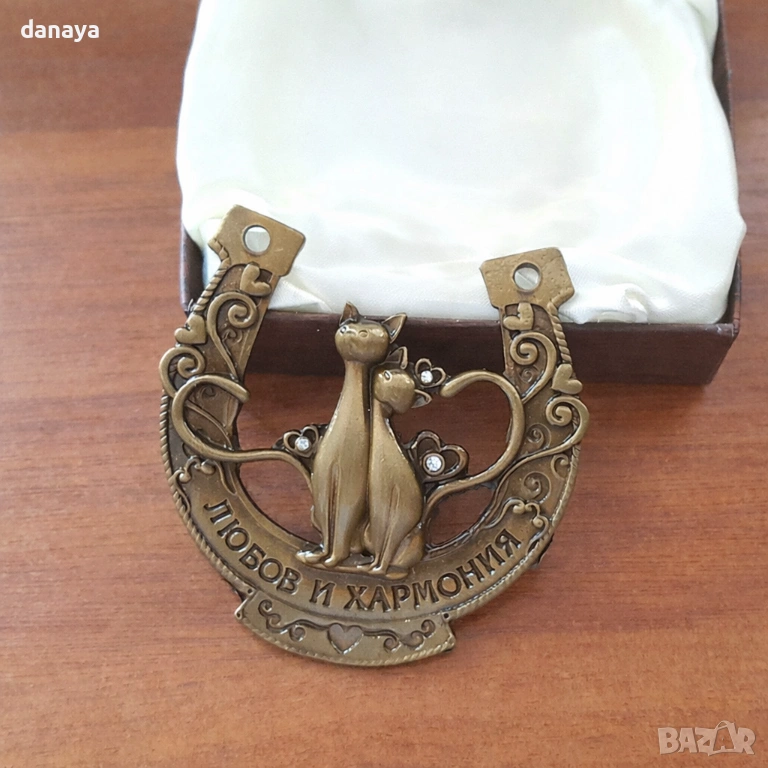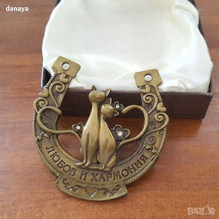 2222 Сувенир подкова с декорация влюбени котки и надпис Любов и хармония