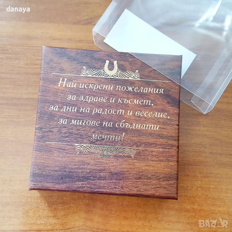 Подковата е поставена в стилна подаръчна кутия, на гърба на която има текст – ” Най-искрени пожелания за здраве и късмет, за дни на радост и веселие, за мигове на сбъднати мечти!”