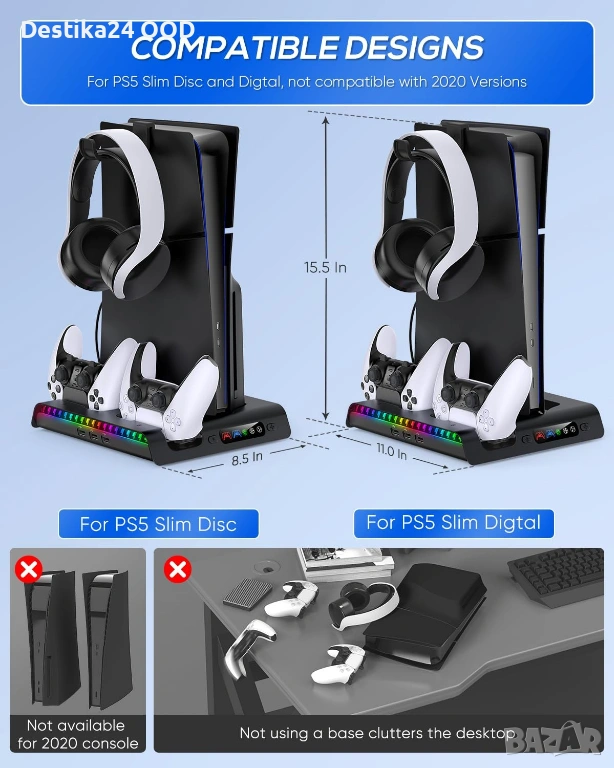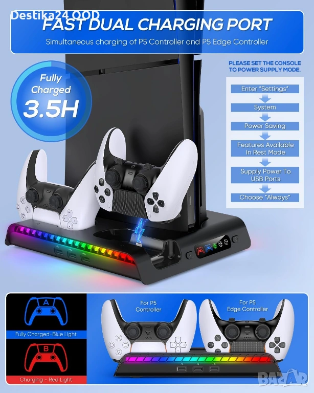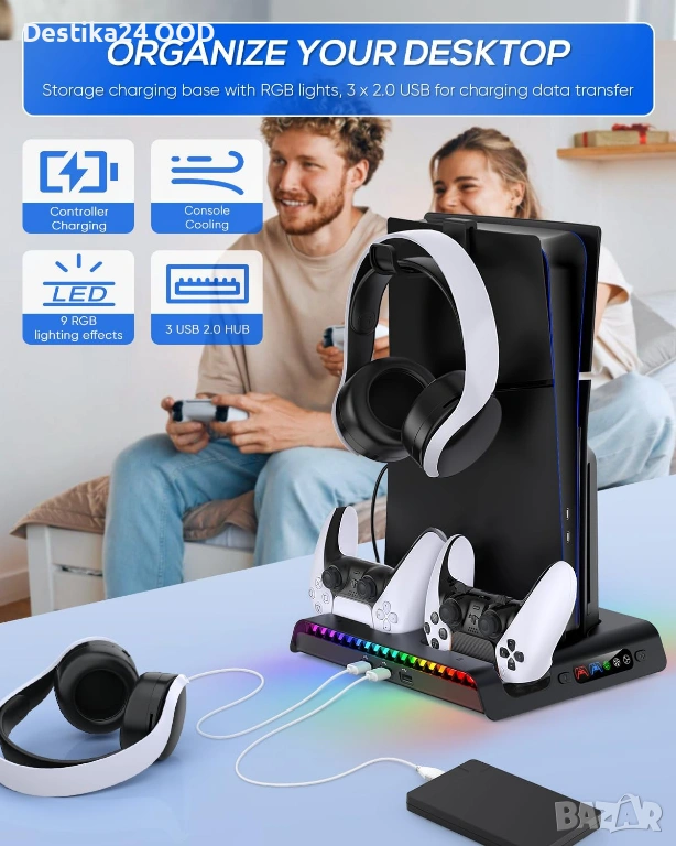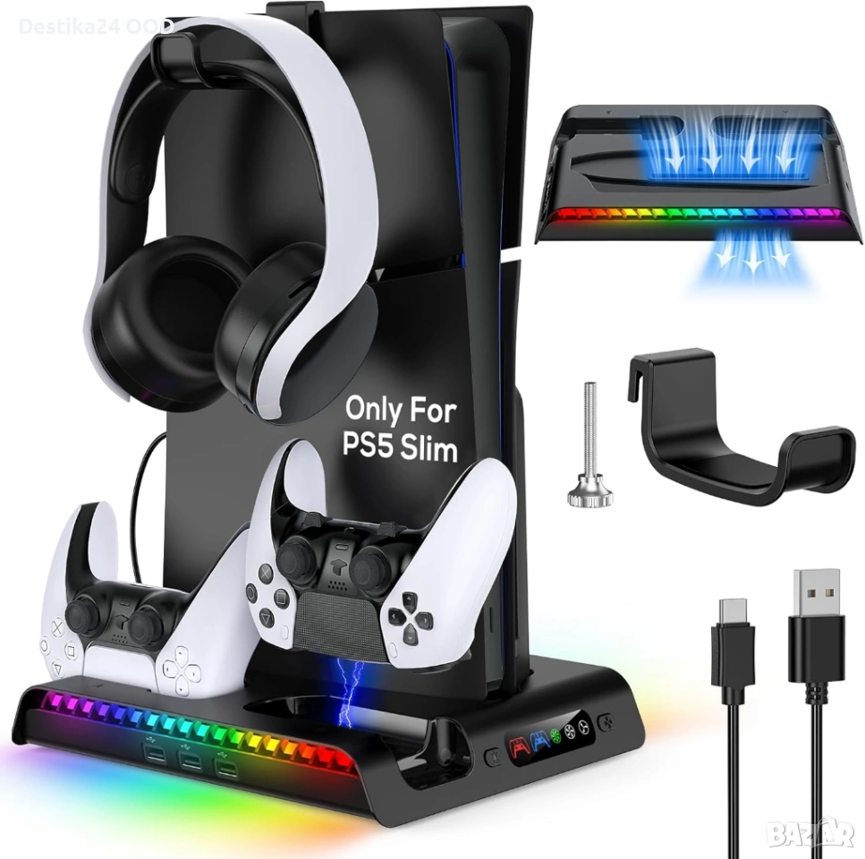 Продавам зарядна стойка за PS5 Slim с RGB осветление и вграден охлаждащ вентилатор. Подходяща за зареждане на контролери и охлаждане на конзолата по време на игра.