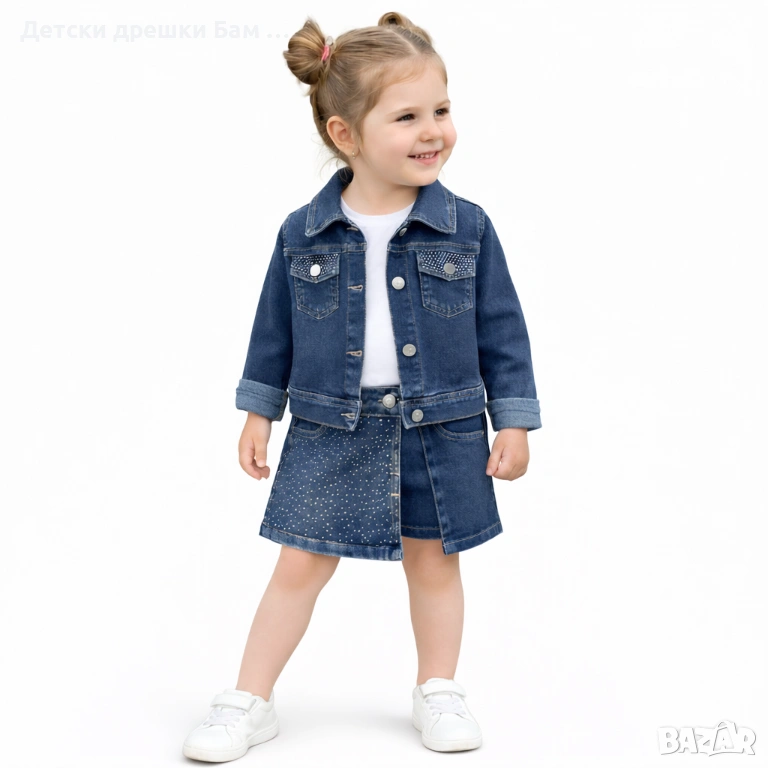 Бутиков дънков комплект за момиче – якенце с камъчета и поличка/панталонки с камъчета.