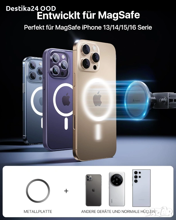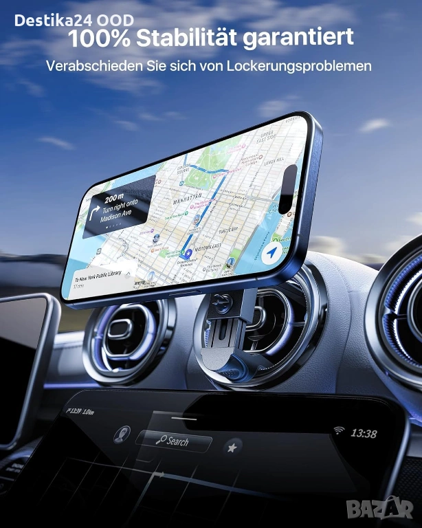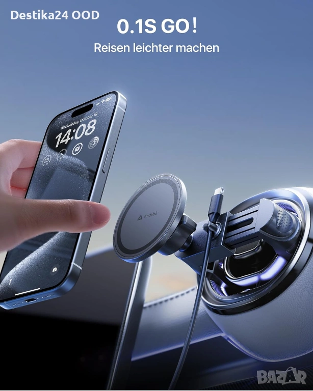 Продавам магнитна стойка за телефон за кола с MagSafe захващане. Предназначена за монтаж на кръгли въздуховоди. Осигурява стабилно задържане на телефона дори при неравности, завои и рязко спиране.