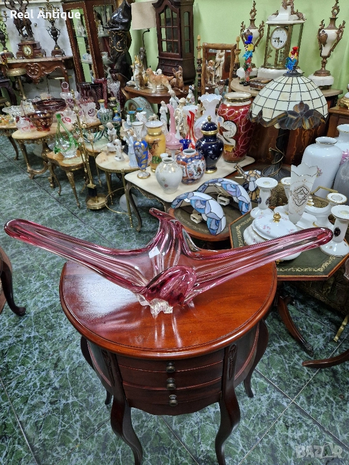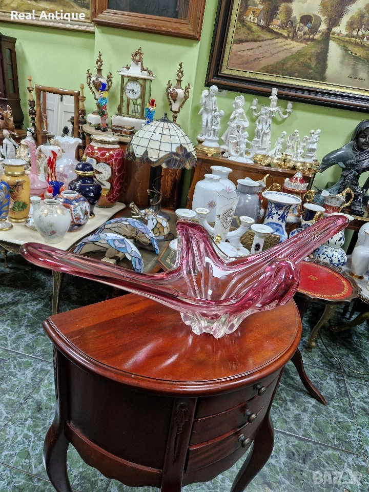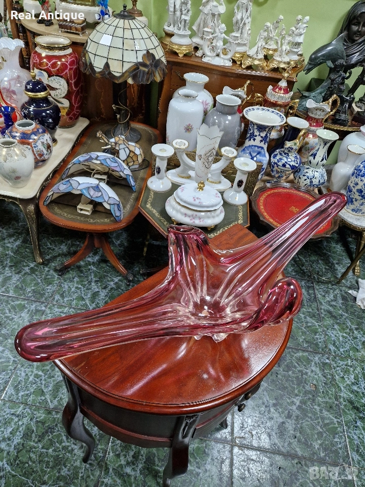 Продавам уникална огромна изключително красива италианска кристална купа фруктиера жардиера Мурано в перфектно състояние без никакви забележки с наличните маркировки. Тежка здрава масивна. Размери дължина 65 см височина 28 см и ширина 20 см. Прекрасно допълнение към интериора на Вашия дом офис вила. Подходяща и за подарък. Работя с всички куриери. Отговарям бързо.