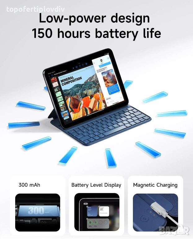 Иновативно решение за захранване - кажете сбогом на тревогата за батерията. Забравили сте да я заредите? Няма проблем! Включеният USB-C кабел се свързва с вашия iPad от единия край и магнитно с клавиатурата от другия - той „заема“ захранване директно от вашия таблет. Вградената батерия от 300 mAh издържа една седмица с пълно зареждане, тествана чрез 300 пълни цикъла на зареждане и разреждане. Клавиатурата не е необходимо да се изключва ръчно, когато не се използва; функцията ѝ за автоматично заспиване интелигентно пести енергия.