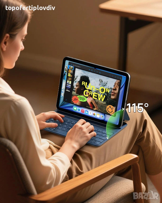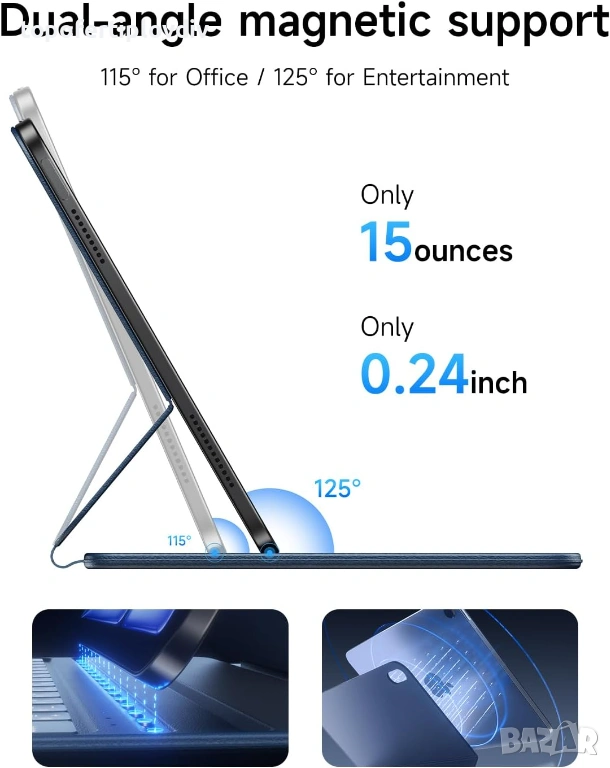 Триъгълна структура, магнитно разделяне за 1 секунда: Двойните магнитни точки (гърб + основа) образуват стабилна триъгълна структура; само леко издърпване разделя клавиатурата и iPad. Работен ъгъл от 115° е идеален за писане, докато ъгъл на релаксация от 125° е перфектен за гледане на филми или четене.