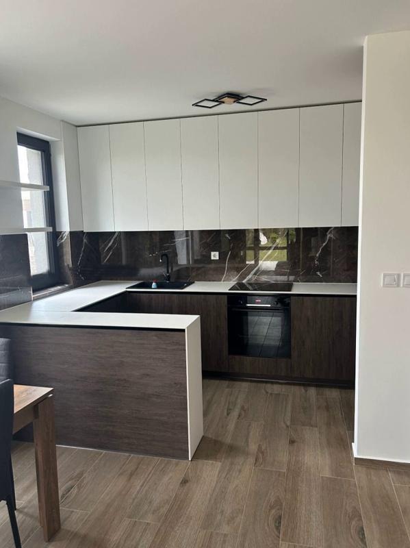 Разпределението включва две спални, просторен хол с кухненски бокс и две бани с тоалетни. Обзаведен, с газово отопление, апартаментът предлага комфорт и удобство. Месечният наем е 1300 EUR.
