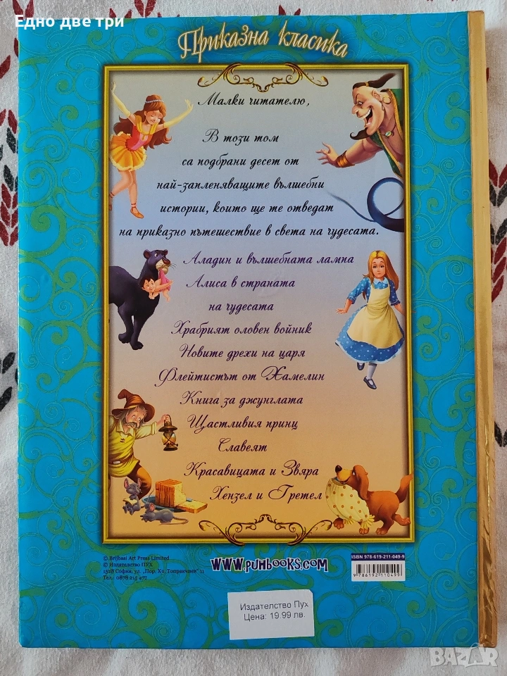 Златна книга на приказките Съдържание Червената шапчица - Шарл Перо Спящата красавица - Шарл Перо Принцесата върху граховото зърно - Ханс Кристиан Андерсен Синята Брада - Шарл Перо Принцесата мишка - Френска народна приказка Принцът жаба - Братя Грим Малечко Палечко - Шарл Перо Магарешката кожа - Шарл Перо Пепеляшка - Шарл Перо Котаракът в чизми - Шарл Перо Рапунцел - Братя Грим Златокоска и трите мечки - Лев Толстой Майчина сълза - Ангел Каралийчев Дивите лебеди - Ханс Кристиан Андерсен Баба Хола - Братя Грим Дядовата ръкавичка - Елин Пелин Рибарят и златната рибка - Братя Грим Цветята на малката Ида - Ханс Кристиан Андерсен Дядо вади ряпа - Българска народна приказка Малката русалка - Ханс Кристиан Андерсен тримата братя и златната ябълка - Българска народна приказка Грозното пате - Ханс Кристиан Андерсен Неродена мома - Българска народна приказка Палечка - Ханс Кристиан Андерсен Педя човек - лакът брада - Българска народна приказка Златното момиче - Българска народна приказка Малката кибритопродавачка - Ханс Кристиан Андерсен Келчо и царската дъщеря - Българска народна приказка Снежната кралица - Ханс Кристиан Андерсен Болен здрав носи - Българска народна приказка Снежанка - Братя Грим Василиса Прекрасната - Руска народна приказка Красавицата и звяра - Френска народна приказка Житената питка - Ангел Каралийчев Трите прасенца - Английска народна приказка Вълкът и седемте козлета - Братя Грим Косе Босе и лисицата - Българска народна приказка Сливи за смет - Българска народна приказка Хитър Петър и сянката му - Българска народна приказка Цена 22 € Като нова Снимка 4 и 5 Приказна класика - Имало едно време.. Съдържание Аладин и вълшебната лампа Алиса в страната на чудесата Храбрият оловен войник Новите дрехи на царя Флейтистът от Хамелин Книга за джунглата Щастливия принц Славеят Красавицата и Звяра Хензел и Гретел Цена 10 € Като нова
