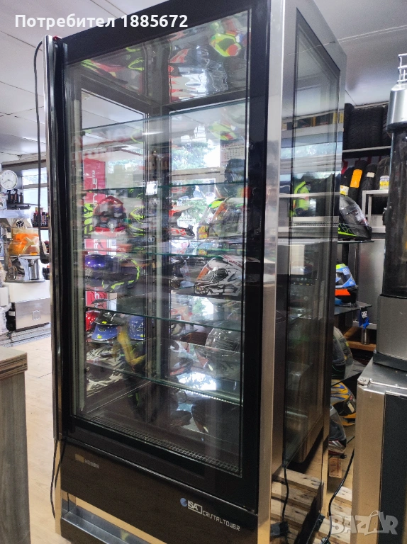Витрината ISA Cristal Tower е идеалното решение за тези, които, макар и да не желаят да жертват висококачественото охлаждане и съхранение на продуктите, обичат дизайна и елегантността и искат да покажат своите творения с пълния им потенциал. Витрината ISA Cristal Tower, с изцяло стъкленото си отделение за показване, предлага максимална видимост на продуктите от всичките четири страни. Хладилната ѝ система е оразмерена така, че да осигури адекватно поддържане на температурата дори при чести отваряния. Монолитната ѝ структура, изолирана с екологичен CO2-експандиран полиуретан, има ниско въздействие върху околната среда. Напълно сменяемо закалено двойно остъклено стъкло. Закалена двойно остъклена врата, ситопечат, в една равнина със страните на витрината. Дръжка за отваряне в стандартната версия. Пълен достъп до двигателния отсек както отпред, така и отзад, благодарение на лесното отстраняване на долните панели. Панта на вратата, оборудвана със самозатваряща се торсионна щанга. Двойни въртящи се колелца (две с ръчни спирачки) за лесно движение.