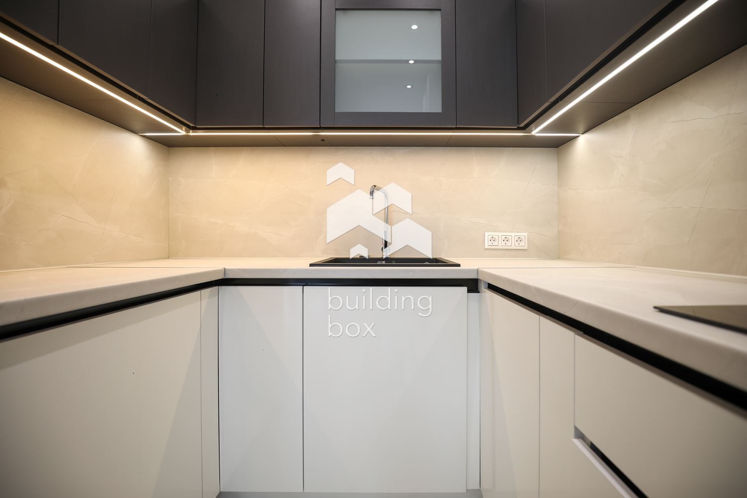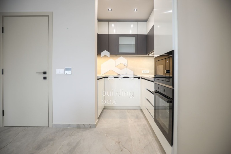 - Кухненски бокс: стъклокерамичен плот, абсорбатор, вградена фурна, микровълнова, пералня и хладилник с