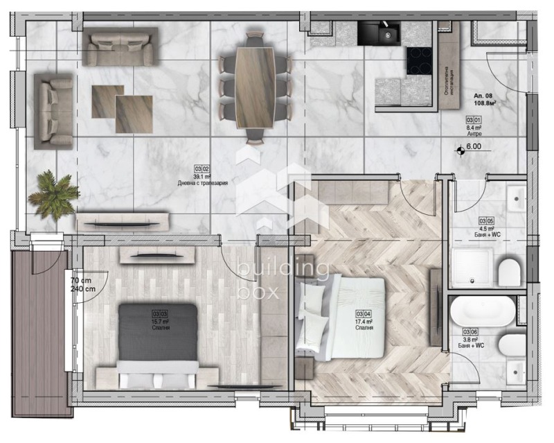 БИЛДИНГ БОКС предлага напълно обзаведен и оборудван източен тристаен апартамент с чиста жилищна площ от 108,10 кв.м.
