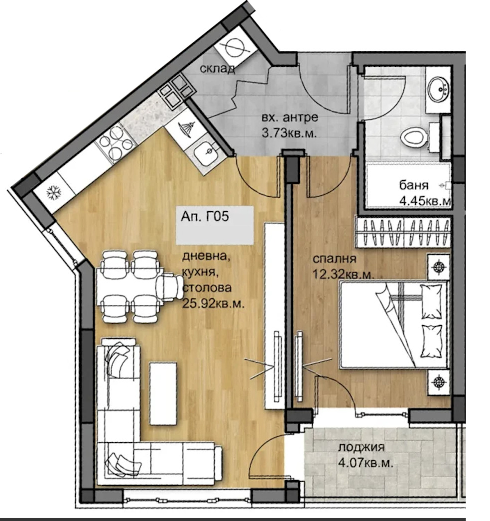 ➡ Двустаен апартамент за продажба състоящ се от входно антре, баня с тоалетна, склад, спалня, дневна с кухня и трапезария, тераса и е с обща площ от 72,05 кв.м.