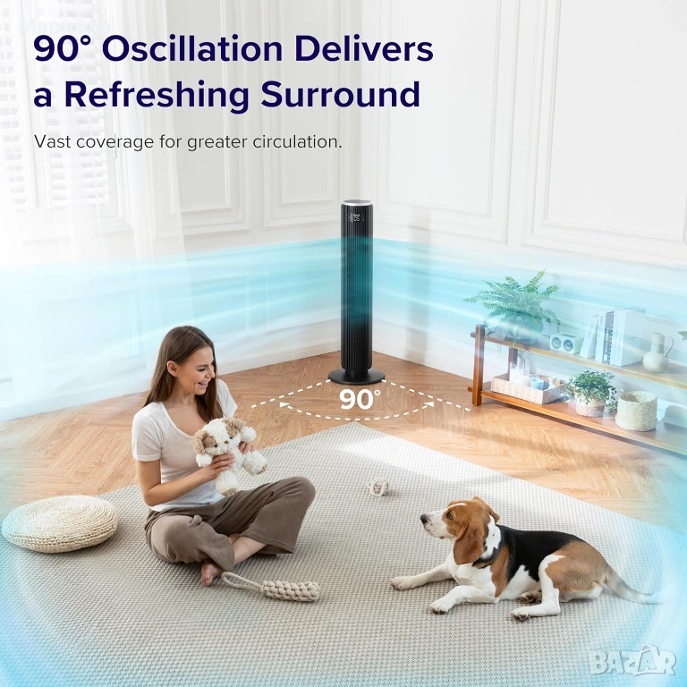 Нашият иновативен дизайн на въздушния поток съчетава извит вход за въздух и уникален дизайн с множество лопатки, създавайки мек, успокояващ бриз, подобен на естествените ветрове.