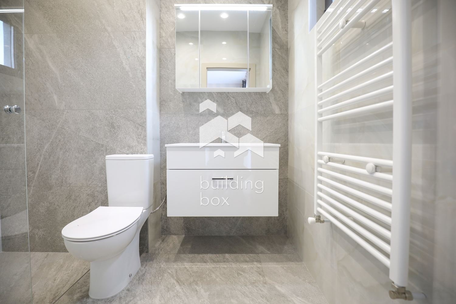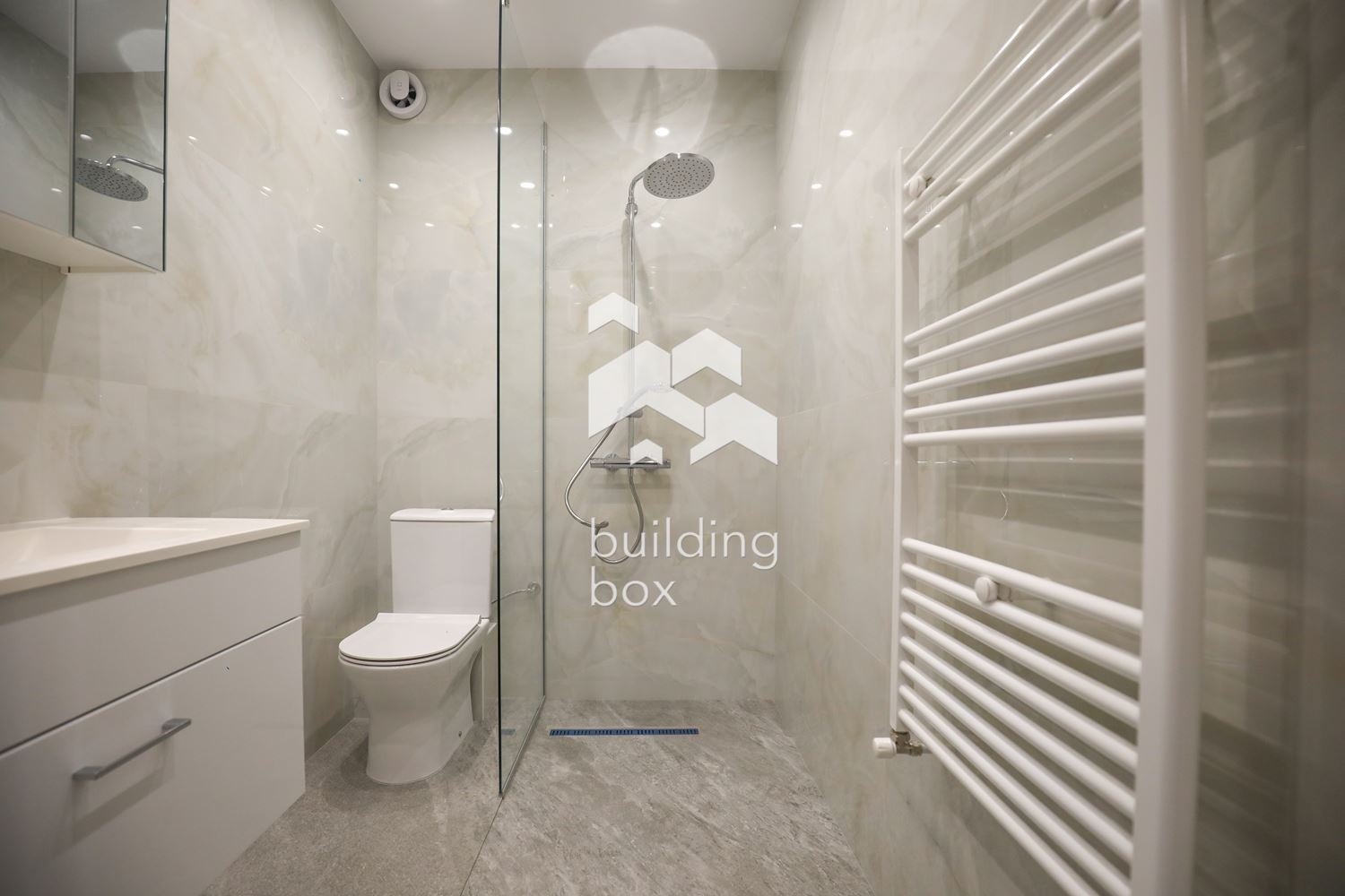 Довършителните работи са с висок клас материали гранитогрес, естествен паркет, алуминиева дограма с троен стъклопакет и 2.80 м светла височина.