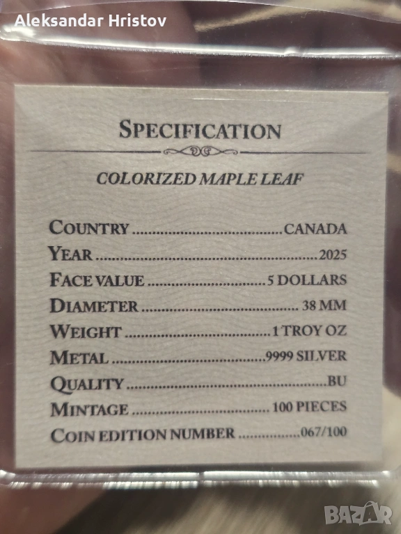 Лимитирана версия на канадската сребърна монета „Кленов лист“ → Обява 53466630