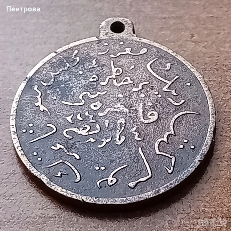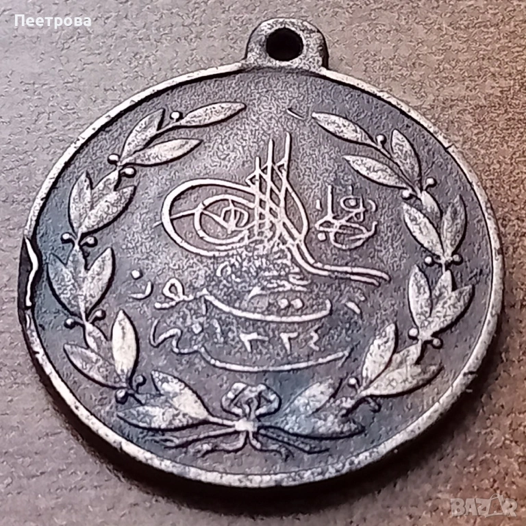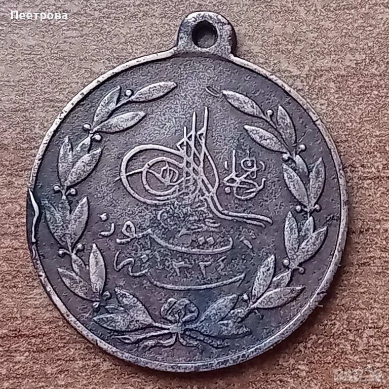 Колекционерски османски медал от периода на султан Мехмед V Решад. Медалът изобразява туграта (официалния подпис/монограм) на султана, заобиколена от лаврови венци, която служи като негов официален печат и подпис. Подобни медали често са били възпоменателни, понякога свързани със събития като Втората конституционна ера или различни военни кампании от този период. Той е свързан със султан Мехмед V Решад, който управлява Османската империя от 1909 до 1918 г. Годината, отбелязана върху медала е 1327 г. по Хиджра, което съответства на 1909 г. от новата ера – годината на неговото възкачване на престола и времето на възстановяването на конституцията. Били са носени като патриотични украшения от привържениците на конституционните реформи в империята. Надписът на обратната страна съдържа религиозни или възпоменателни текстове на арабски / османотурски език (с арабска графика), които обикновено прославят свободата, равенството и справедливостта — основните лозунги на Младотурската революция. Те са разположени около централни символи, често включващи кръстосани знамена или националния герб. Текстът прокламира четирите стълба на новия конституционен ред: Hürriyet (Хюриет): Свобода. Adalet (Адалет): Справедливост. Müsavat (Мюсават): Равенство. Uhuvvet (Ухувет): Братство. Допълнителни надписи: Kanun-i Esasi (Канун-и Есаси): Основен закон (Конституция). Yadigâr (Ядигар): Спомен / Възпоменание. Има и датата на обявяване на Конституцията по Руми календара (съответства на 24 юли 1908 г.). Тези думи не са просто декорация, а политическа декларация за края на абсолютната власт на султана и началото на демократични реформи в империята. Анатомия и символика на туграта - Sere (Сери): Долната част, където са изписани името на султана и това на баща му („Абдул Хамид хан, син на Абдул Меджид“) заедно с почетната титла „Винаги победоносен“ (el-muzaffer daima). Tuğ (Туг): Трите вертикални линии в горната част, които символизират независимостта и суверенитета на владетеля. Beyze (Бейзе): Двете елипсовидни извивки вляво (буквално „яйца“). Според някои интерпретации те представляват двете морета, над които е властвал султанът — Черно море (малката извивка) и Средиземно море (голямата). Hançer (Ханчер): Извивката вдясно, която прилича на нож или меч и е символ на силата и войнската мощ. Zülfe (Зюлфе): Малките „S“-образни криви, пресичащи вертикалните линии, които се свързват с посоката на вятъра от изток на запад — посоката на османското разширение. Поставянето на туграта върху възпоменателен медал за Конституцията от 1908 г. е иронично: тя символизира абсолютната власт на султана, която по това време е силно ограничена от революцията на Младотурците. Тя присъства, за да легитимира медала като официално признат символ на новия държавен строй.