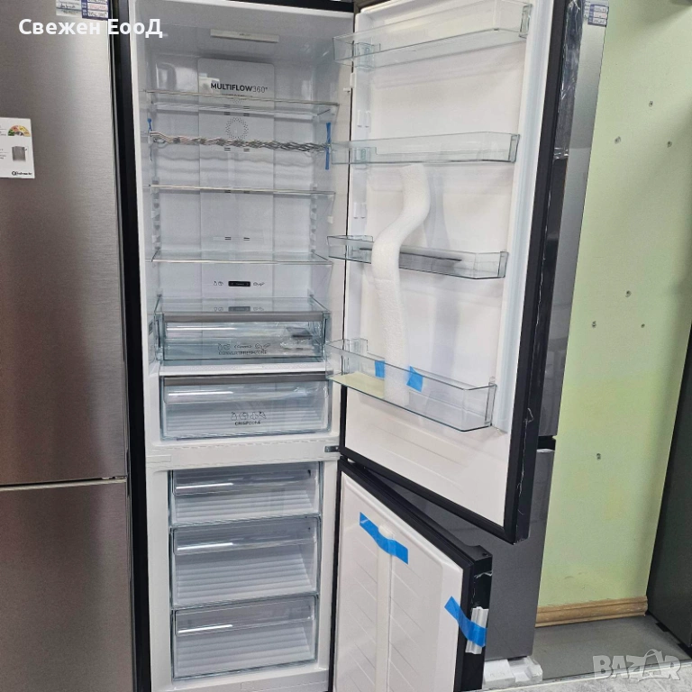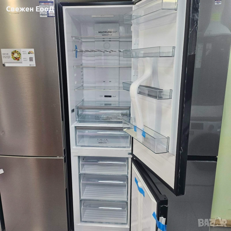 NoFrost+: една от най-добрите охладителни системи на пазара, инсталирана във фризерното отделение, предотвратява натрупването на лед и скреж, поддържайки ниска консумация на енергия. Това оптимизира капацитета за съхранение и елиминира необходимостта от размразяване и почистване на вътрешността. Освен това, замразените храни не слепват, което ги поддържа подредени и чисти във фризера.