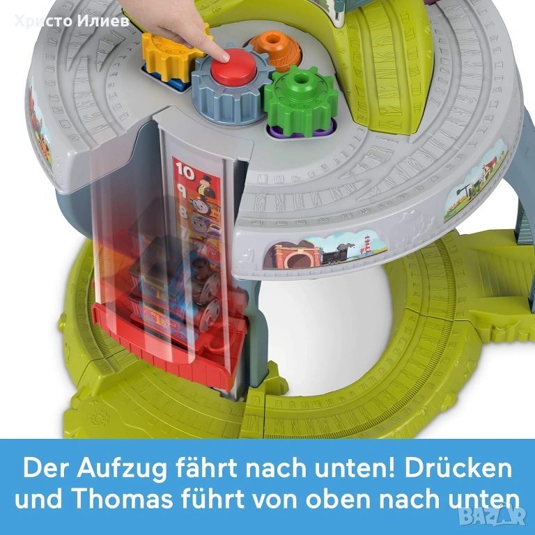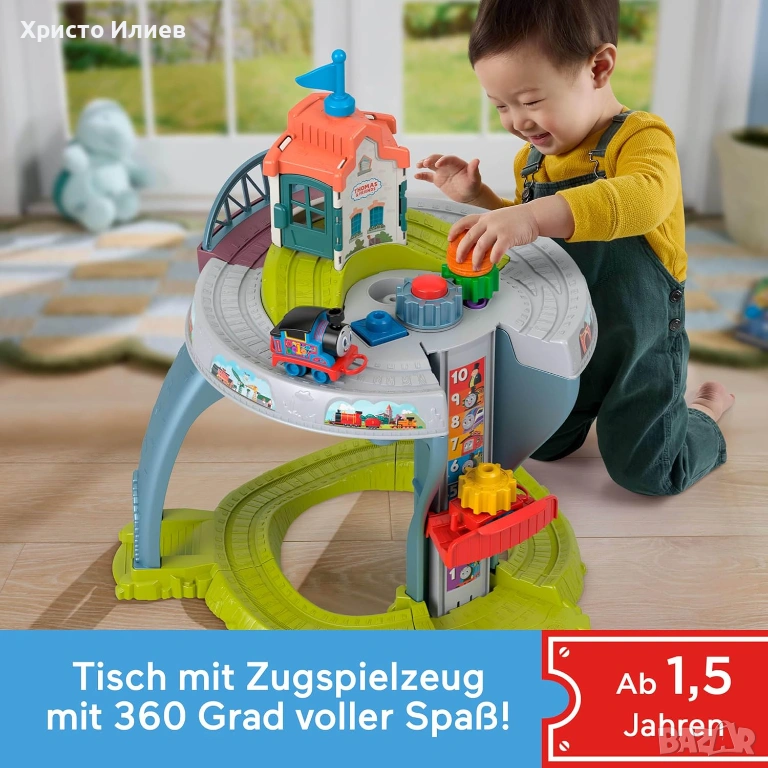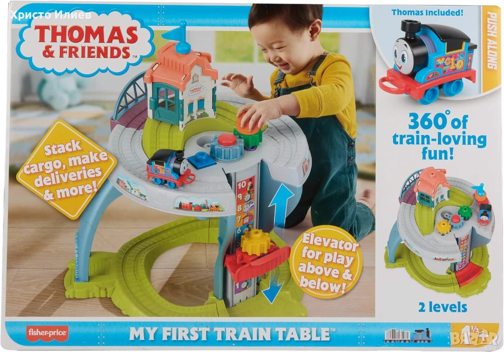 Малчуганите поемат контрола над цялото вълнуващо влаково действие с Thomas & Friends Моята първа масичка от Fisher-Price. Тази влакова маса е висока над 63 см и предлага 2 нива релси, подвижен мост тип „люлка“, асансьор и 5 елемента за игра, с които децата могат да подреждат, товарят и разтоварват карго товари. Комплектът е изпълнен със занимания, подходящи за най-малките! Децата ще се забавляват, като бутат локомотивчето Томас по релсите – тръгвайки от депото Tidmouth Sheds и преминавайки през Содор, за да правят доставки, точно както в сериала. Малчуганите могат да събират допълнителни локомотивчета от серията Thomas & Friends My First и да ги добавят към масата за още влаково забавление. (Допълнителните локомотивчета се продават отделно.)