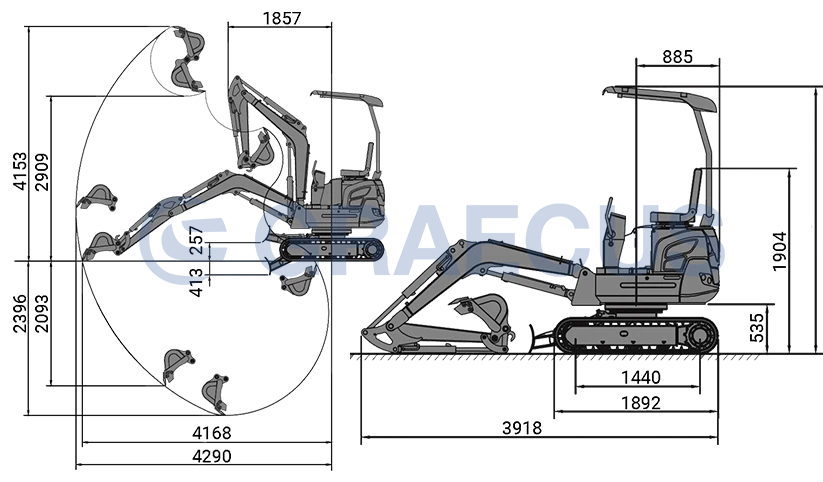Технически спецификации Оборудване Въртене на стрелата В странично положение Ширина на пълзящия механизъм Сгъваеми релси 114 140 см Контроли Странични лостове (пилот) Размери и тегло Тегло 2700 кг Ширина 1140 1400 мм Дължина 3918 мм Височина 2469 мм (+климатичен агрегат) Мотор Мотор ДИЗЕЛОВ KUBOTA D1105 трицилиндров Конски сили (максимална непрекъсната мощност) 19 к. с. 2200 об/мин Охлаждане на двигателя Водно охлаждане Разход на гориво 3 л/ч Капацитет на резервоара за гориво 22 л Хидравлична система Главна помпа Бутала Сила на копаене с кофа 1700 кг Хидравлично захранване 61, 9 л/мин Хидравлично налягане 220 бара Охладител за хидравлично масло има Капацитет на резервоара за хидравлично масло 25, 3 л Времена за изчакване на хидравликата 2 на бума Система за шофиране и управление Тягови двигатели 2 независими с хидравлично заключване. Скорост на движение 1, 7 3, 0 км/ч Ротационен мотор EATON USA с хидравлично заключване. Ротация 360 Скорост на въртене 9 об/мин Максимален работен наклон 30º Електрическа система Електрическа система 12V Електрическа енергия 5W Технически характеристики на кофата Работна ширина (кофа) 450 мм Предлагаме багери GRAECUS от 800кг. до 4т. РС Ауто ЕООД гр. Хасково / Димитровградско шосе Регионален представител на марка: GRAECUS