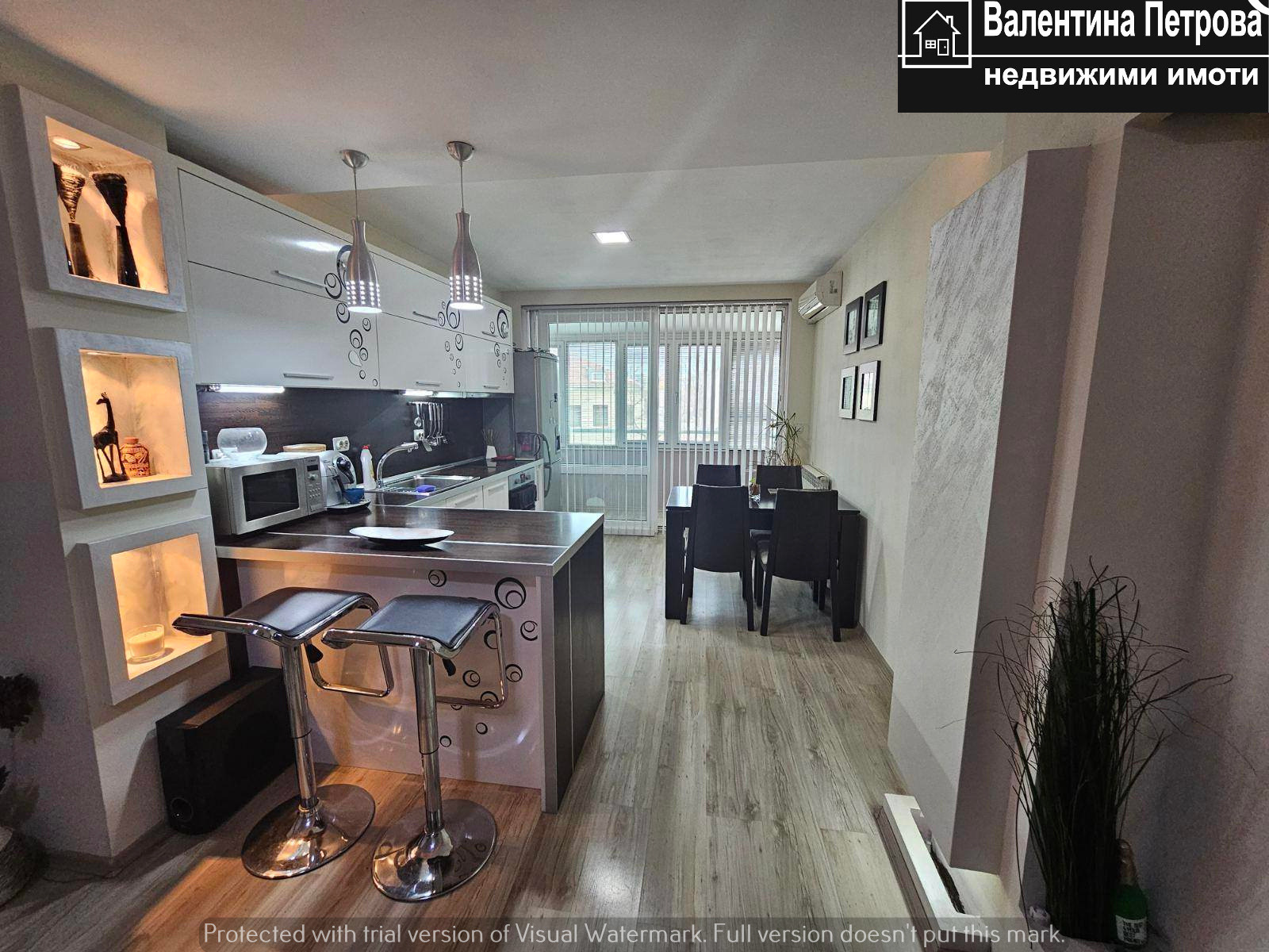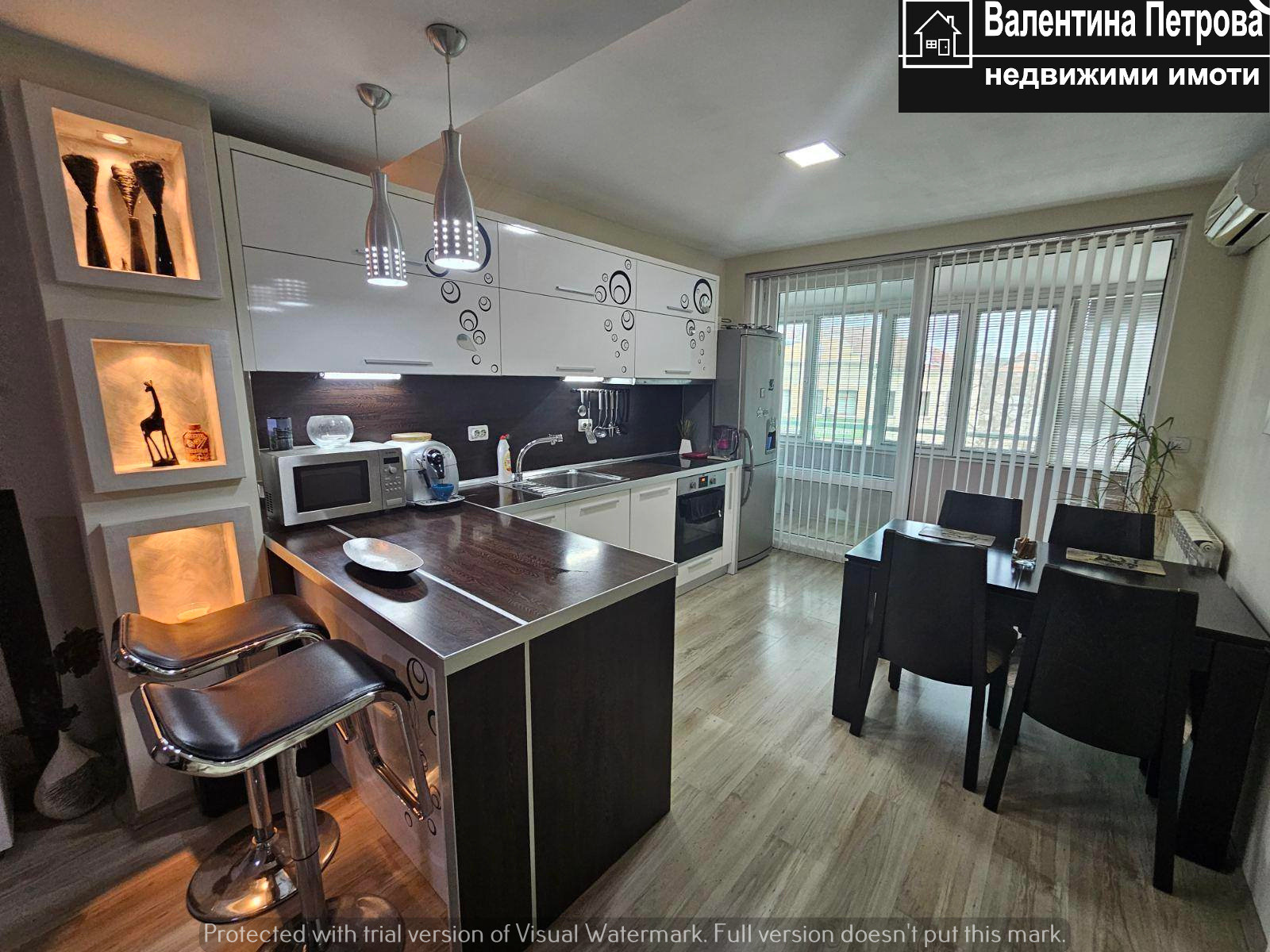 В.Петрова -Недвижими имоти отдава тристаен апартамент е разположен на ет.4/4 в санирана сграда (без асансьор) със следното разпределение: дневен тракт около с обособена кухненска, трапезарна и холова част, две големи самостоятелни спални, две закрити тераси, Г-образен коридор, баня и тоалетна отделно. Апартамента е основно ремонтиран, като всички стени и тавани са с гипсокартон и изолационна вата, подовите настилки са ламинат, стени шпакловани и боядисани в меки тонове, висококачествена PVC дограма, интериорни МДФ врати , входна врата Solid и др. Кухнята разполага с всички необходими електроуреди ( вградена фурна със стъклокерамични котлони, нова съдомиялна, аспиратор, пералня със сушилня-нова, хладилник с диспенсър за вода, микровълнова, кафе робот). Отоплението е на ТЕЦ, а за охлаждане има монтирани два инверторни климатика. На партерно ниво има стая за общо ползване, подходяща за детски колички, колелета и др. Входа е изключително чист и поддържан, с добри съседи. При желание на наемателя, без допълнително заплащане, може да се ползва гараж, подходящ за голям автомобил, който се намира точно пред входа. Жилището ще бъде свободно за наемане след 01.03.2026г. Без домашни любимци