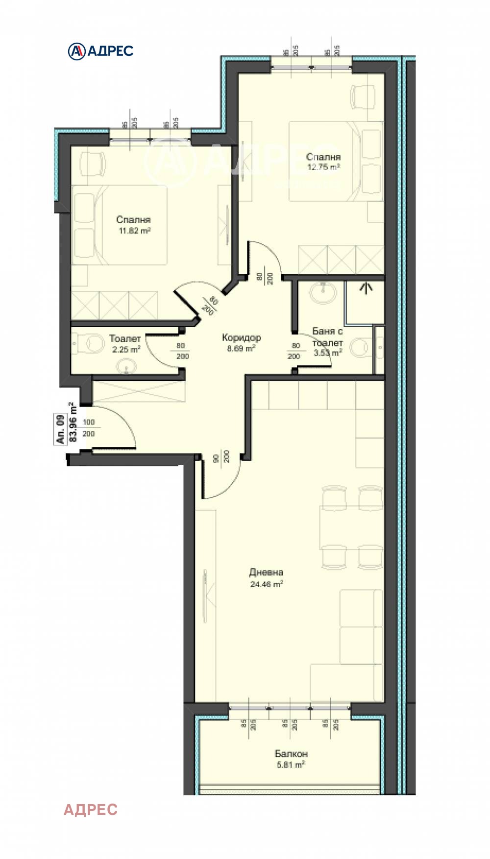 Жилището разполага с площ от 92 кв.м. разпределена в коридор, дневен тракт с кухненски бокс, две спални, балкон, баня и тоалетна, и втори санитарен възел.