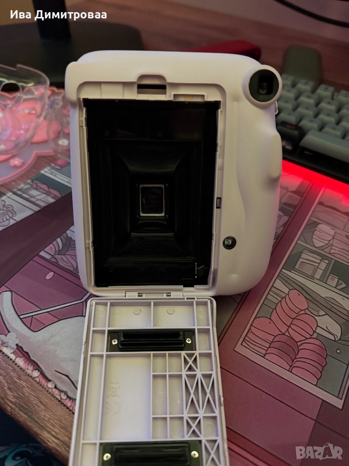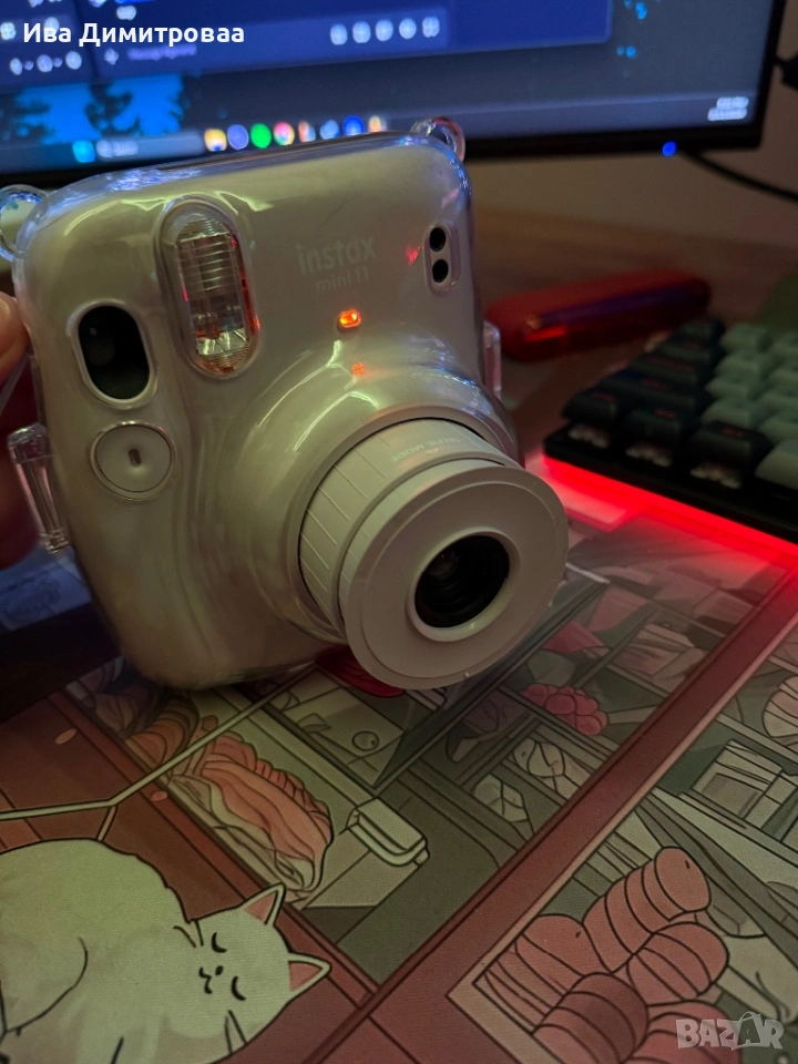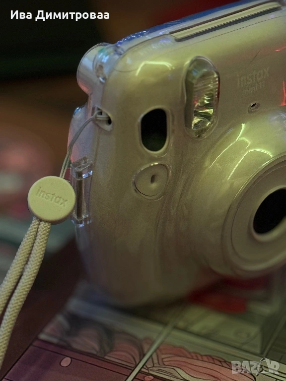 Камера за моменти снимки Instax Mini 11. Камерата е в добро състояние. Единствено падна тази най-горна пластмасова частица, която е на обектива, но не играе никаква роля по-скоро предпазна, но както се вижда фотоапарата идва с калъф.