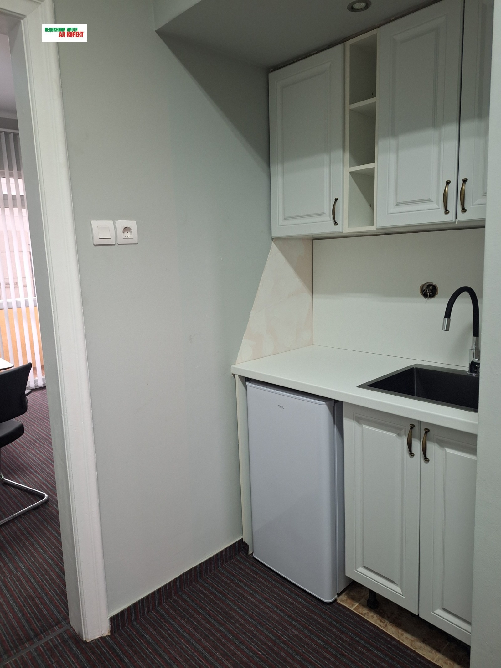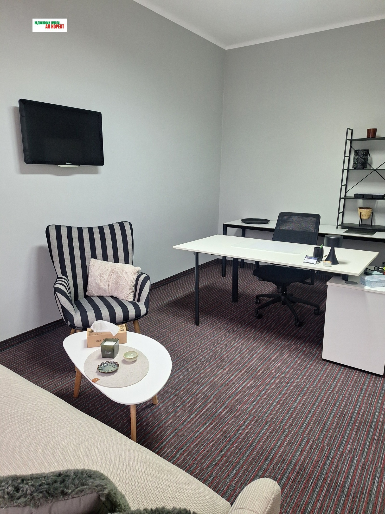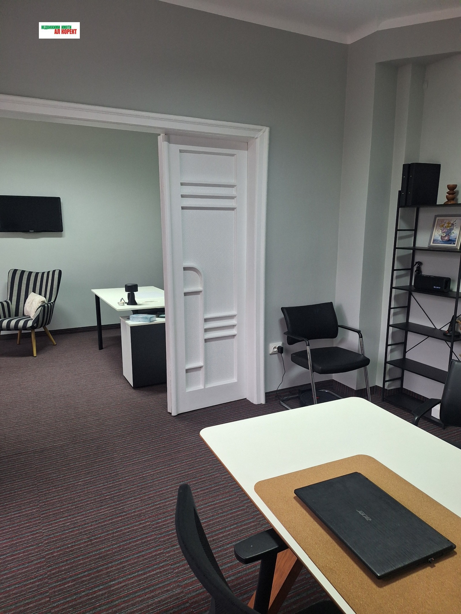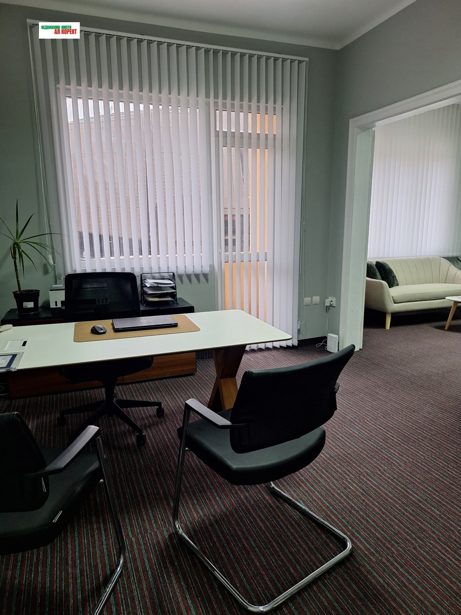 Имотът е напълно обзаведен с големи бюра, диван и фотьойл уютна и представителна среда, готова за незабавно ползване.