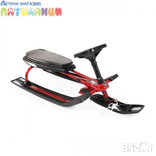 Невероятният помощник за зимно развлечение е върху две стабилни ски, които не позволяват преобръщане. Ските са уребрени за по-лесно завиване.