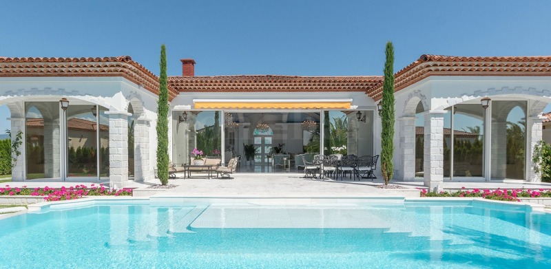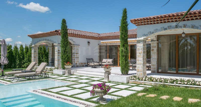 Вилата е стилно обзаведена с индивидуално изработени мебели, а в интериора са използвани естествени материали като мрамор и дърво, създаващи усещане за елегантност, топлина и хармония.