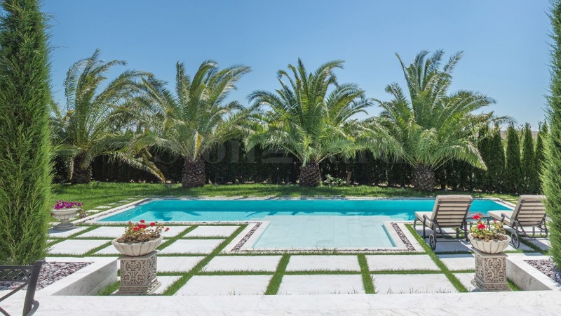 В двора централно е разположен впечатляващ басейн с площ 41,5 кв. м, изцяло облицован с мрамор и заобиколен от богато озеленена градина с екзотични дървета и цветя. Около басейна са обособени зони за шезлонги и релакс, които допълват атмосферата на спокойствие и комфорт.