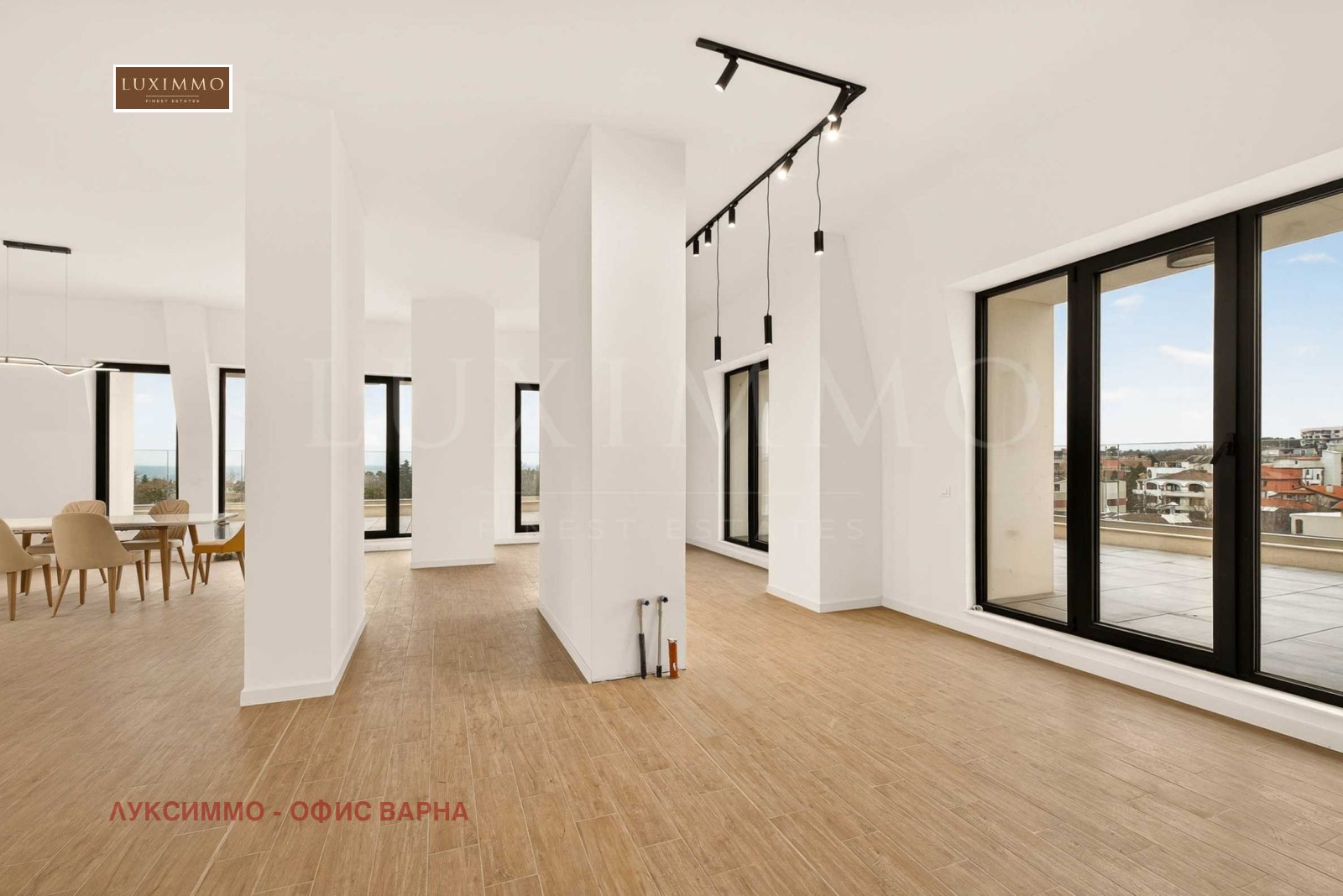 Този уникален имот с обща площ от 331,37 кв.м представлява съвкупност от два апартамента обединени в един по време на строителството, заемащи целия последен, 6-и етаж във входа на сградата. Това е позволило да се осигури директен достъп до апартамента от асансьора. Към апартамента има прилежаща маза с квадратура 3,7 кв.м. В подземния гараж на комплекса се предлагат паркоместа на цени около 65000 евро /127 129 лв./.
