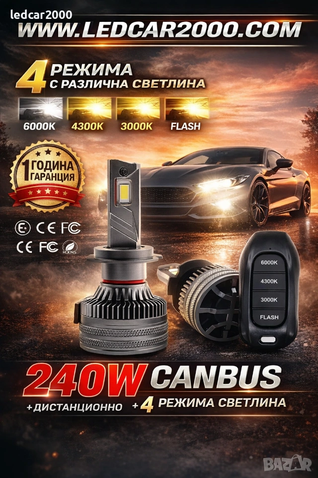 Тези крушки съчетават всичко в едно. Те са със специално дистанционно управление, с което можете да сменяте светлината между 3000K, 4300K и 6000K, както и да активирате бонус режим „Flash“ (интензивно премигване). Всички тези режими са на ваше разположение само с едно натискане на бутона на дистанционното, без да слизате от автомобила.