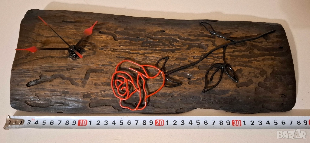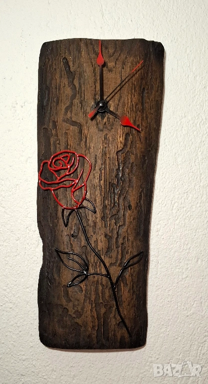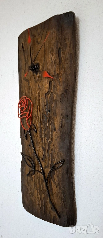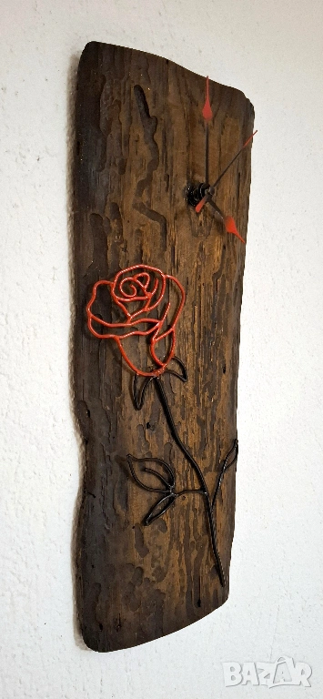 Върху дървената основа е ръчно изработена метална роза – елегантна, изящна и изпълнена с внимание към всеки контур. Червените ѝ линии създават впечатляващ контраст с тъмното дърво, а черните метални листа придават стил и завършеност.