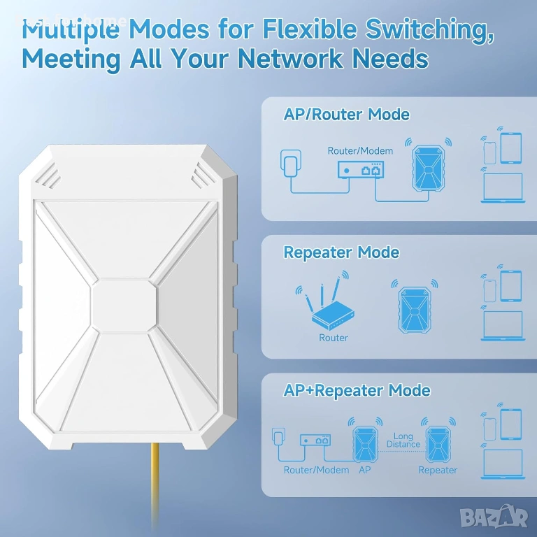 【Подходящ за всякакви метеорологични условия】Този външен Wi-Fi усилвател е устойчив на атмосферни влияния IP67, изработен е от водоустойчив, устойчив на топлина и студ материал, което осигурява нормална работа при екстремни студове, високи температури, гръмотевични бури или постоянна влажност и гарантира, че устройството ще продължи да работи стабилно при всякакви метеорологични условия.