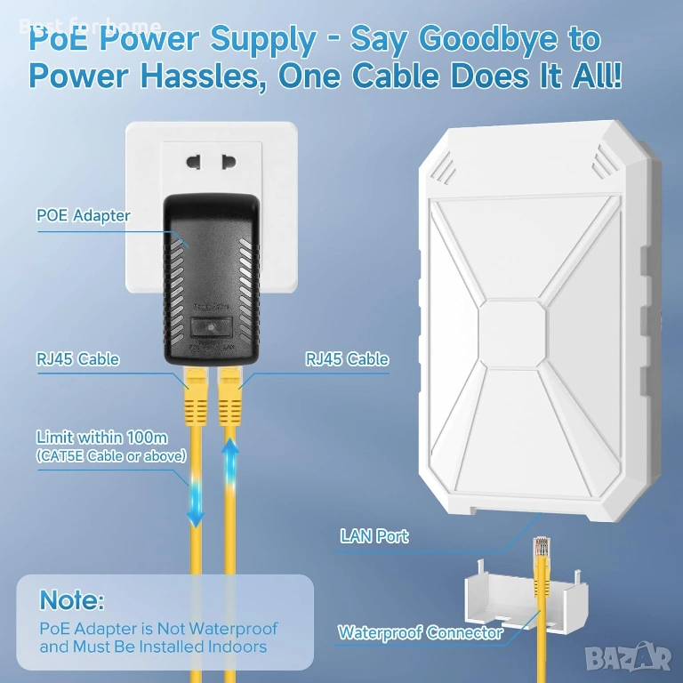 【Гъвкава инсталация на пасивно PoE】Този външен Wi-Fi ретранслатор използва иновативната технология за пасивно PoE, елиминирайки нуждата от допълнителен захранващ адаптер. Необходим е само един кабел за едновременно захранване и предаване на данни. Може да се инсталира гъвкаво на всяко място на открито, идеален за външни сценарии, където няма фиксирано захранване. Забележка: PoE конверторът не е водоустойчив