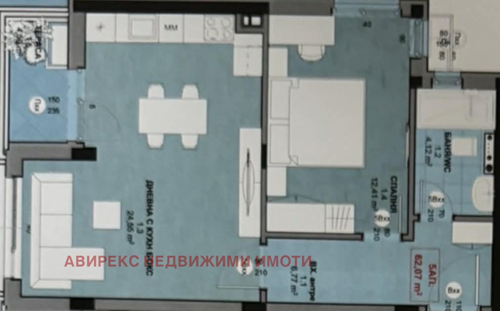 Разпределение: хол с кухня, спалня, баня с тоалетна и тераса.