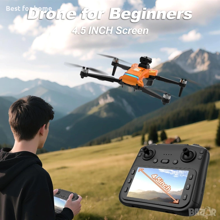 4K камера дрон: Насладете се на 4K кадри от въздуха в реално време от този дрон чрез 4,5-инчовия екран. Включва 4GB SD карта и четец. Дистанционно регулирайте 90° обектива на дрона за кинематографични гледки.