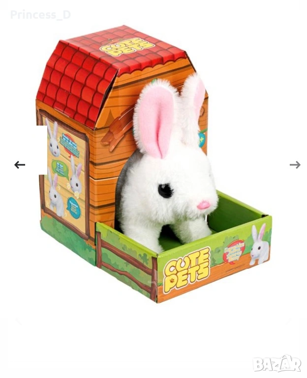 1.Играчка на батерии, зайче изцяло бяло с розови ушички. Движи ушите и носа си, мърка и ходи. Не е отваряно, в оригиналната си кутия.