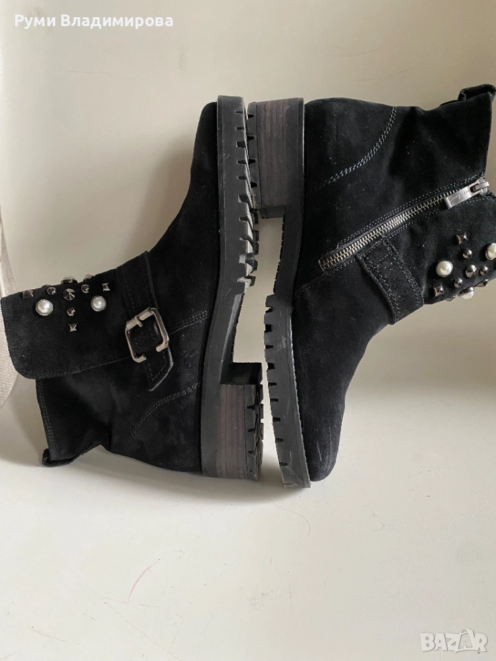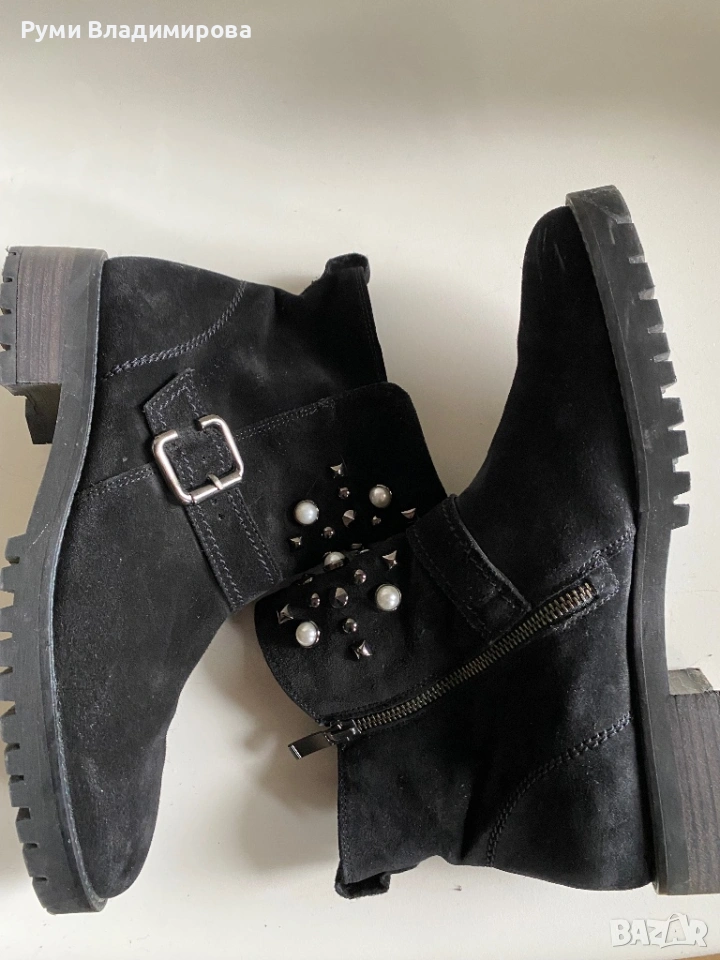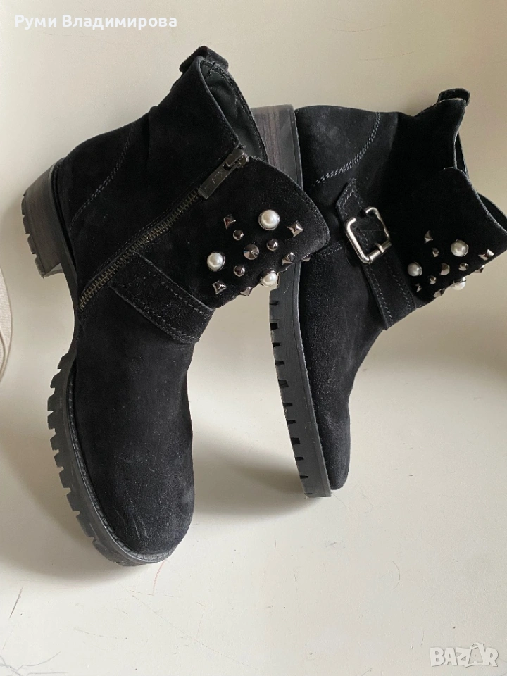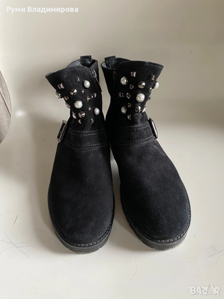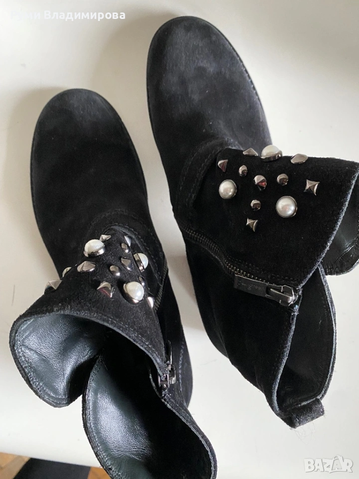 Черни, велурени боти с перли и капси, Paul Green N 40, с цип, отговарят на размера си, но са за тесен крак, много ефектни с тази украса от изкуствени перли, стабилна подметка, употребявани, в отличен вид, без забележки, доставка с Еконт.