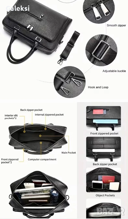 Изработена с красива лицева фасада с ципове и едно основно, обемно отделение разделено на две странични с удобна преграда, облицована с луксозен хастар.