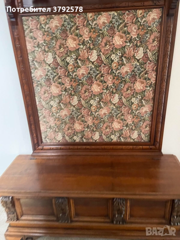 Мебелта впечатлява с елегантна висока облегалка с декоративни резбовани орнаменти и стилна текстилна дамаска с класически флорален мотив. Долната част е масивна, стабилна конструкция с фино изработени детайли и орнаментирани колони.