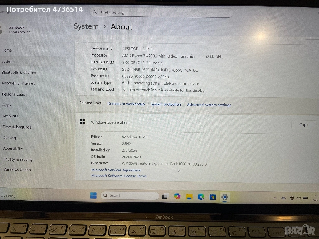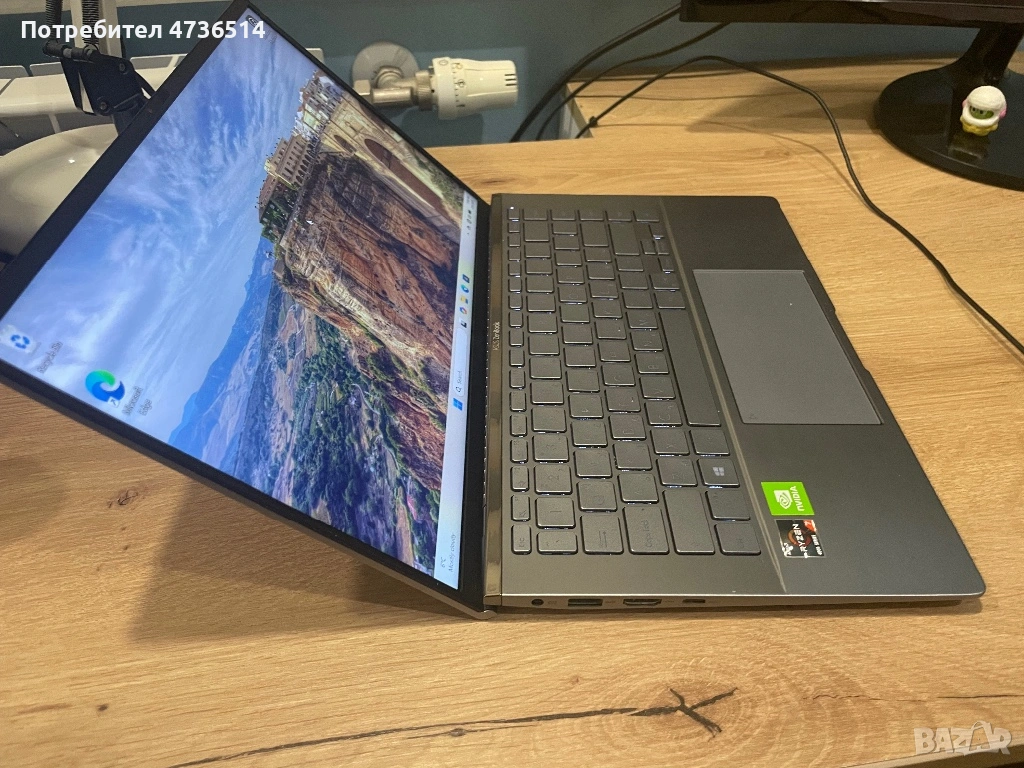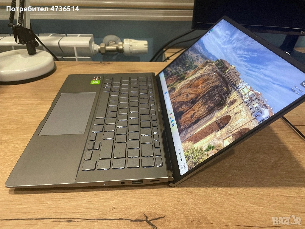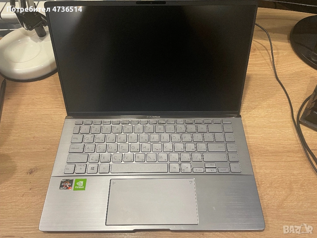 Продавам използван лаптоп Asus Zenbook 14 UM433I. Лаптопът е закупен 2021 година от АрдесБг. Използван е рядко(3-4 пъти в годината) за по 2-3 дена. Лаптопът работи без технически проблеми, чудесен е, както за работа, така и за филми (екранът има 100% точност на цветовете). Лаптопът има numpad, който може да се активира върху trackpad-a. Има леки следи от употреба. Не е отварян или ремонтиран. С лаптопа е включено оригиналното зарядно.