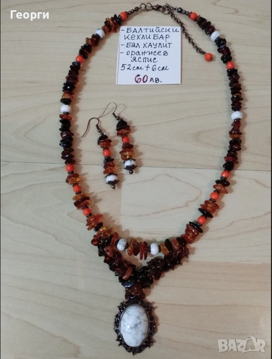 Комбинацията от балтийски кехлибар, оранжев яспис и бял хаулит създава красив контраст между топли медни тонове и нежно бяло излъчване. Акцентът е впечатляваща висулка с бял камък в богато орнаментирана рамка, която придава характер и винтидж стил.