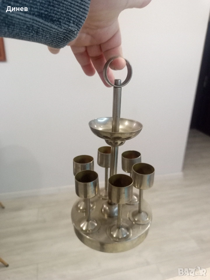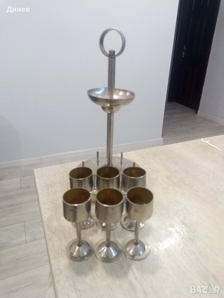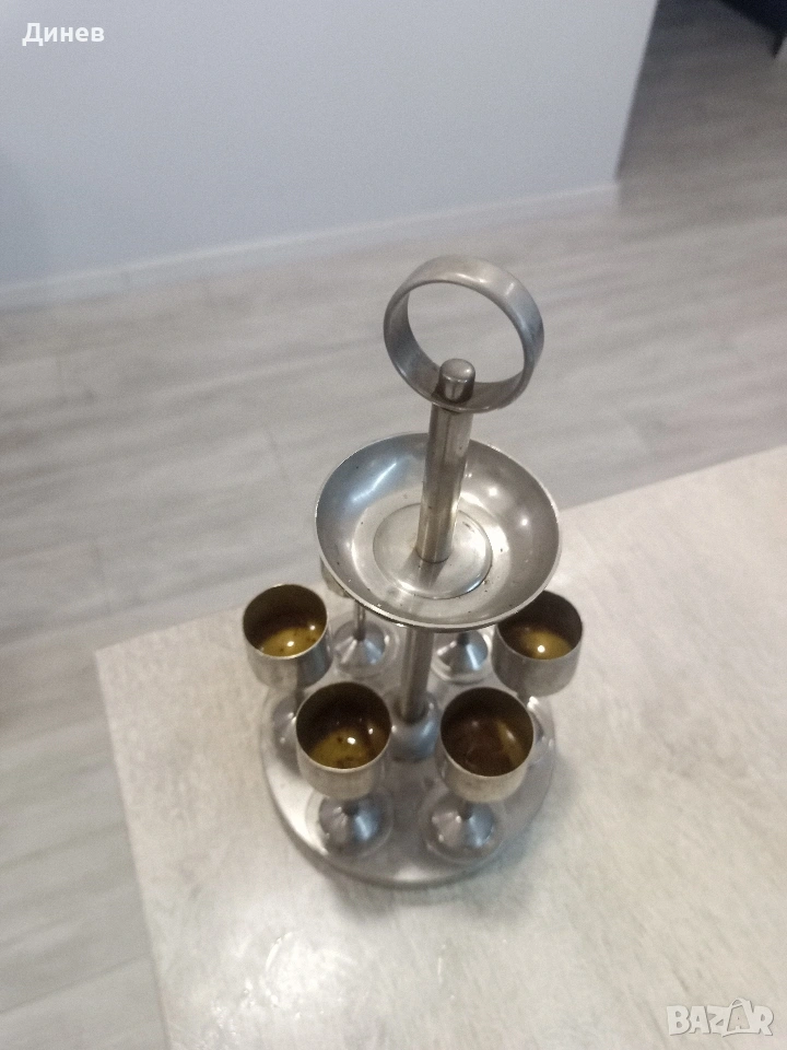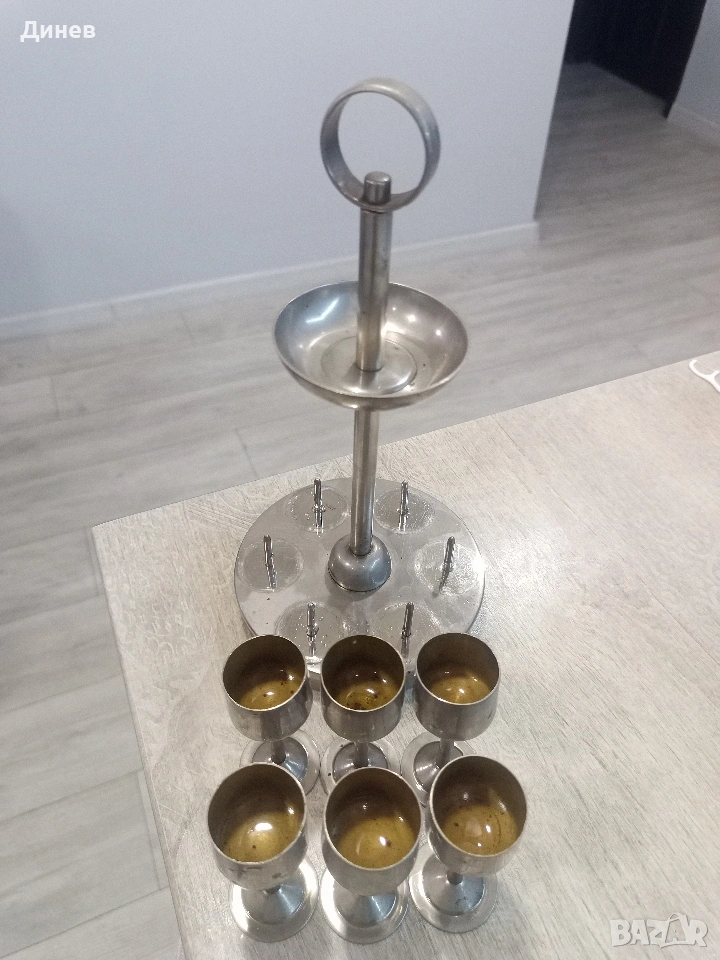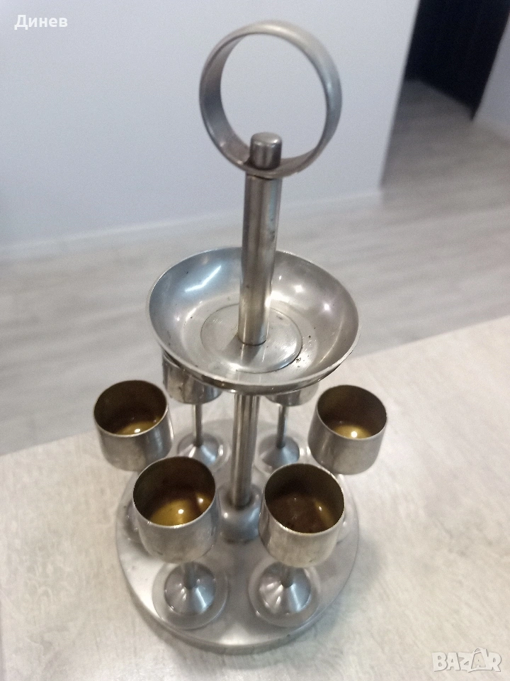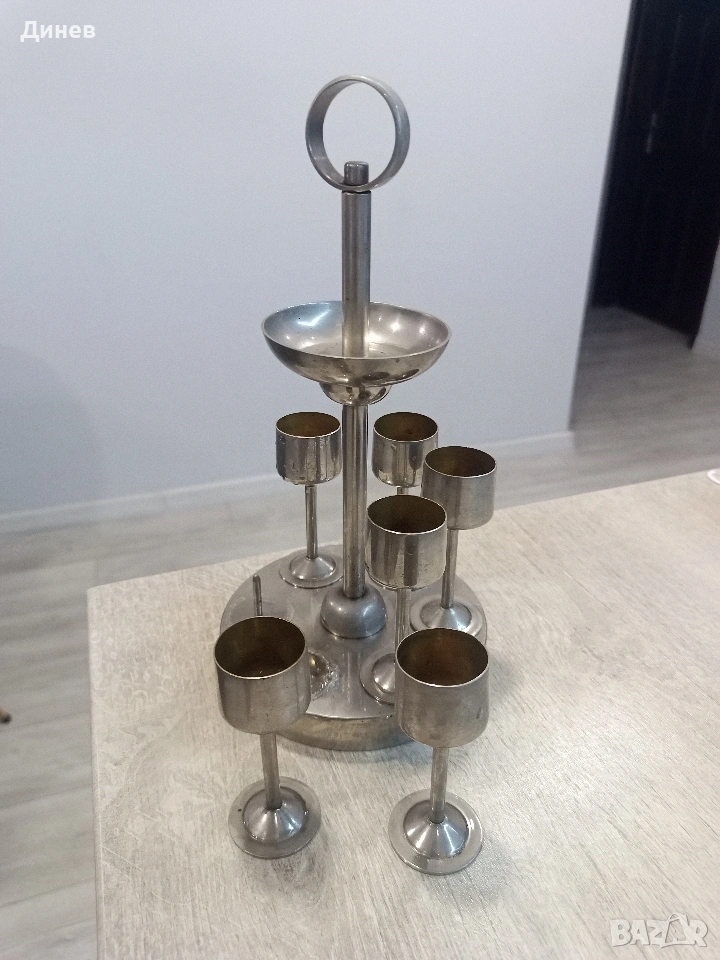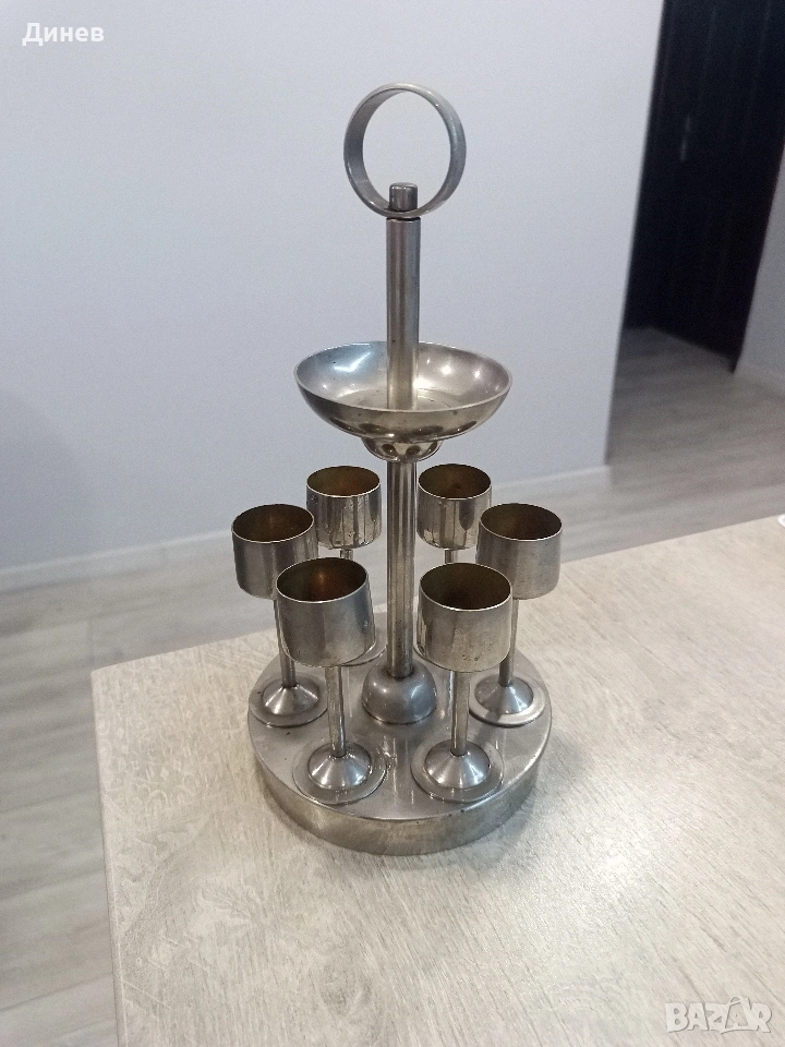 Продавам автентичен, луксозен комплект за сервиране на ракия и ликьор, изработен през 70-те години на миналия век. Този предмет е образец на българския индустриален модернизъм и носи духа на една специфична епоха. ИСТОРИЯ И ПРЕСТИЖ Подобни метални сервизи са били символ на висок статус и гостоприемство. Известно е, че Тодор Живков е предпочитал именно този тип изчистени и практични предмети. Те са били неизменна част от интериора в държавните резиденции и представителните ловни домове, където са се посрещали най-важните гости. ХАРАКТЕРИСТИКИ И КАЧЕСТВО Материал: Висококачествена неръждаема стомана (хром-никел) с огледален блясък. Изключително масивен и вечен материал, който не потъмнява и не се влияе от времето. Функционален дизайн: Комплектът включва централна стойка с ергономична дръжка, интегрирана чинийка за мезе (ядки, маслини или деликатеси) и 6 елегантни метални чаши на столче. Предимство на метала: За разлика от стъклото, металните чаши поддържат напитката хладна за много по-дълъг период от време – идеално за ценителите на студената ракия. Мобилност: Дизайнът позволява целият сервиз да бъде пренасян лесно и стабилно с една ръка. СЪСТОЯНИЕ Сетът е отлично запазен, без никакви следи от корозия или механични повреди. Повърхностите са в перфектен вид, готови за незабавна употреба или за поставяне в колекция. ПРИЛОЖЕНИЕ Изключително подходящ за: Подарък за ценители на ретро стила и българската история. Декорация на домашни барове, механи, вили или ловни хижи. Колекционери на предмети от епохата на социализма. ДЕТАЙЛИ ЗА ПРОДАЖБАТА Цена: (Въведете Вашата цена) Доставка: Изпращам с куриер по Ваш избор с опция "Преглед" преди заплащане. Възможно е и лично предаване. Инвестирайте в предмет, който не само служи вярно, но и разказва история!