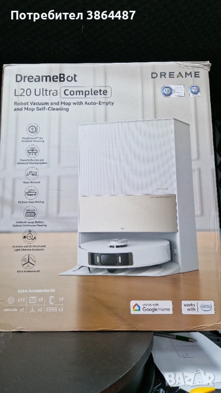 Прахосмукачка робот Dreame L20 Ultra / AI 3D Camera / Auto-Empty / Mop Wash-Dry /МорЕхtеnd, снимка 1 - Прахосмукачки - 53472310 Прахосмукачка робот Dreame L20 Ultra / AI 3D Camera / Auto-Empty / Mop Wash-Dry /МорЕхtеnd, снимка 2 - Прахосмукачки - 53472310 1/2