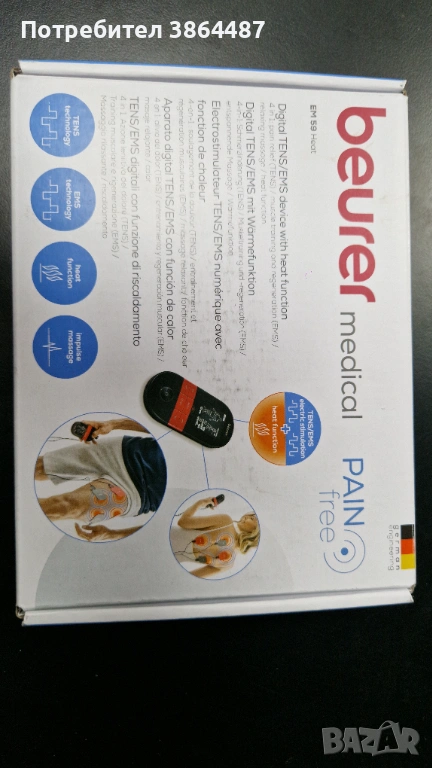 НОВ електростимулатор Beurer EM 59, TENS, EMS, 4 електрода, Затопляне, 64 програми