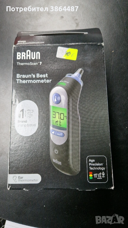 Ушен термометър Braun, Thermoscan 7, IRT6520B, Инфрачервен, Цифров, Черен → Обява 53472400