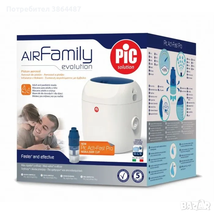PIC Solution Air Family Evolution представлява инхалатор, проектиран и произведен според най-новите иновации. Новата микро-бутална технология, прави модела изключително компактен и удобен за използване, като същевременно предлага висока ефективност. Air Family Evolution е медицинско устройство от клас IIa, което превръща лекарствата от течност или суспензия в аерозолни частици, които се прилагат директно върху дихателните пътища. Този пулверизатор може да се ползва в домашни условия за лечение на всички членове на семейството, както и в специализирани медицински институции. Устройството е предназначено за лечение на всички белодробни и сезонни заболявания и е съвместим с всички препарати,за инхалаторна терапия. Новата PiC Acti Fast Pro чашка прави терапията до 20% по-бърза. Компактен, лек, с включено отделение за аксесоари и чанта за съхранение,което позволява да е с вас навсякъде. Пълен комплект аксесоари, включително маска за деца (включително бебета) и възрастни